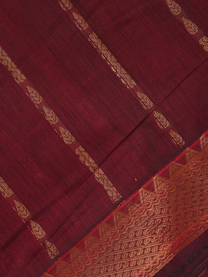 Radiate traditional charm with this exquisite Maroon Striped Woven Cotton Saree. Crafted from premium cotton, it features elegant zari-woven stripes running across the body, creating a subtle yet sophisticated texture. The saree is enhanced with a rich copper zari border that adds a luxurious contrast and a classic appeal. Lightweight and breathable, this saree is perfect for both festive and casual occasions, offering effortless grace and comfort throughout the day.