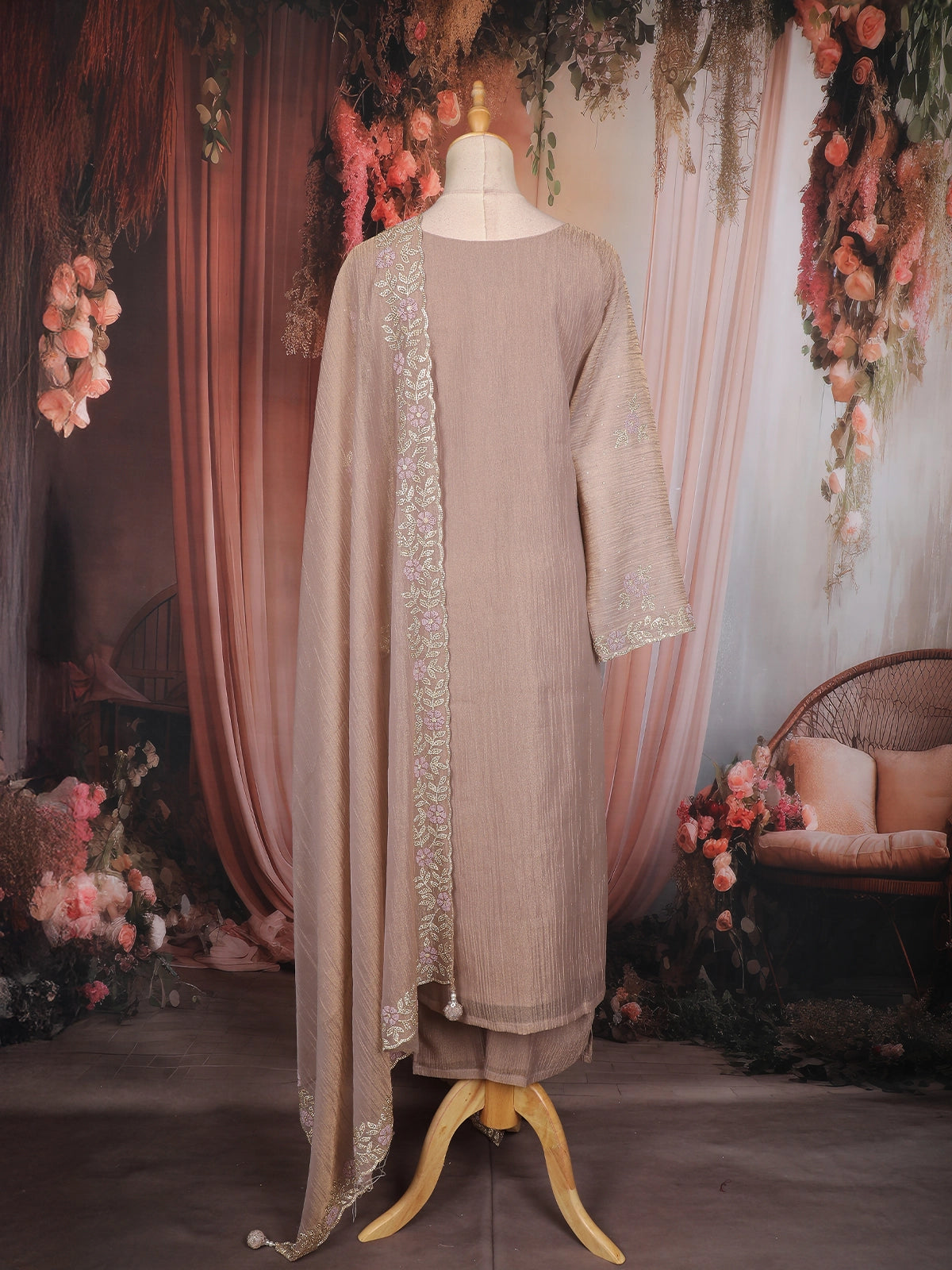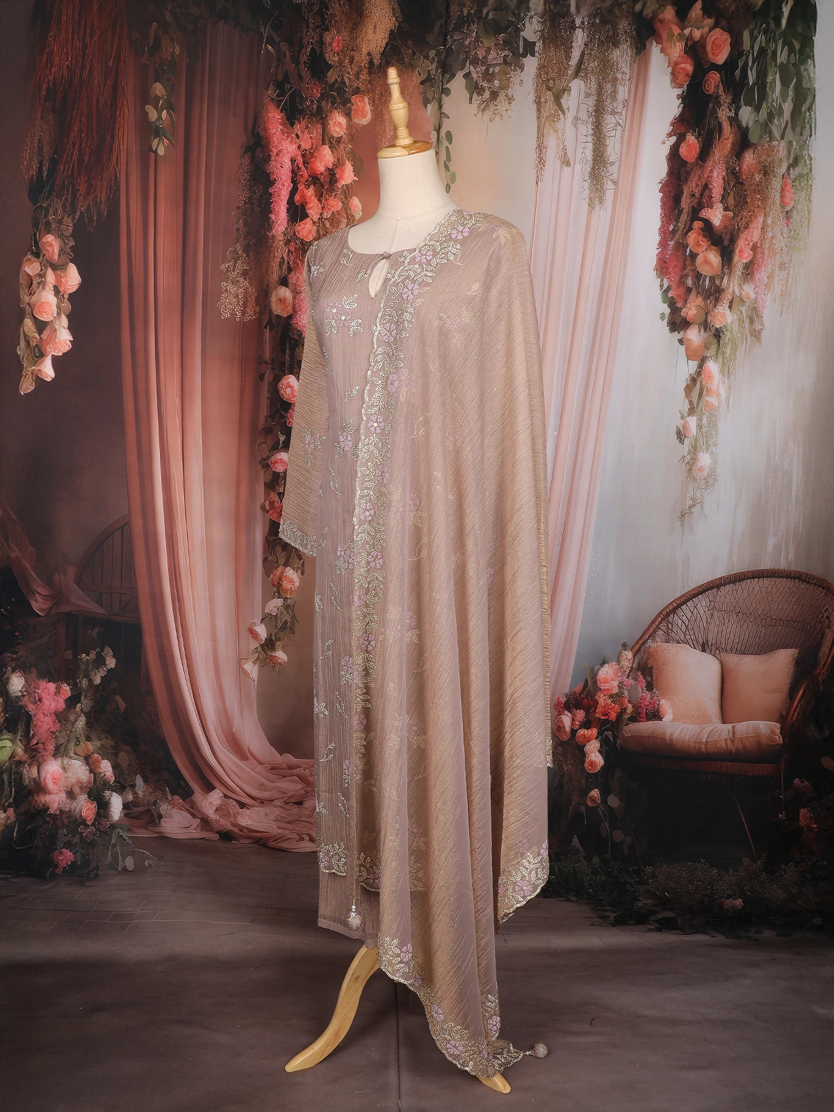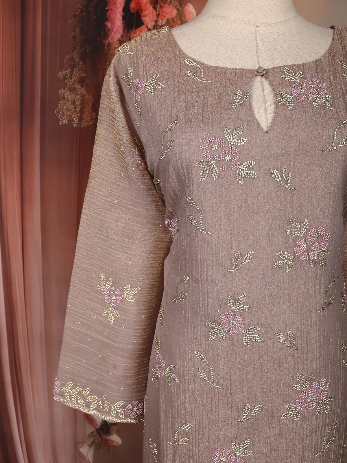 Exude understated elegance with this Mauve straight cut salwar suit, crafted in premium tissue silk that offers a soft shimmer and refined texture. The kurta is delicately enhanced with floral embroidery accented by subtle sequins, lending a graceful sparkle without overpowering the ensemble. Designed in a clean straight silhouette, it ensures a flattering fit while maintaining all-day comfort.