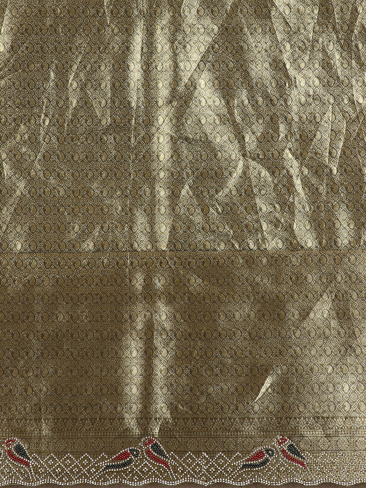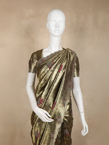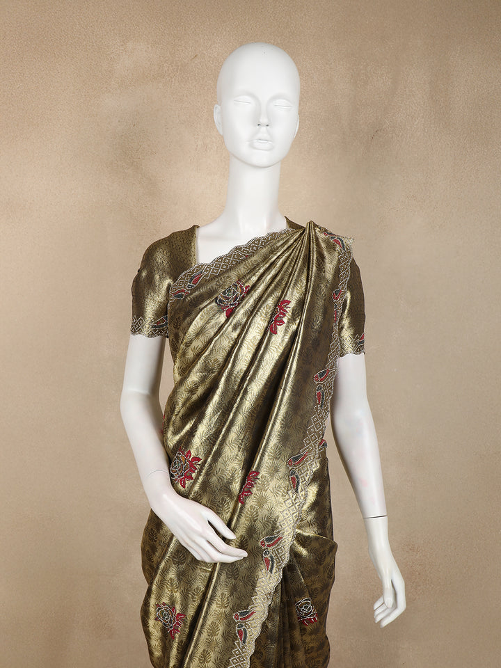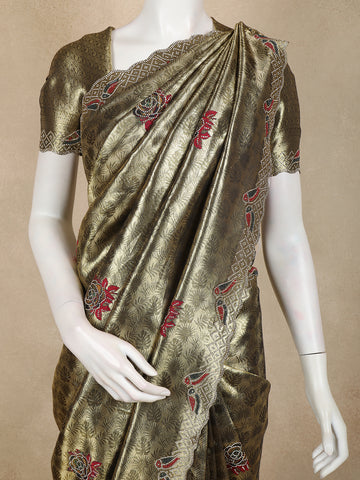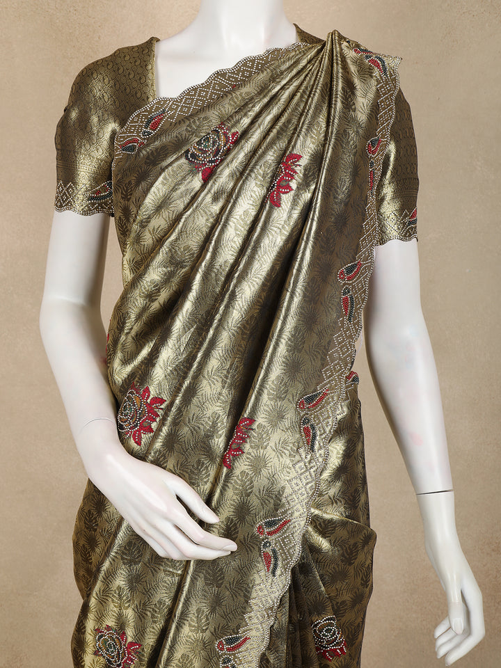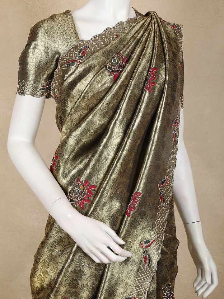 Metallic Olive Green Banarasi Silk Saree with Embroidered Floral Motifs and Designer Border