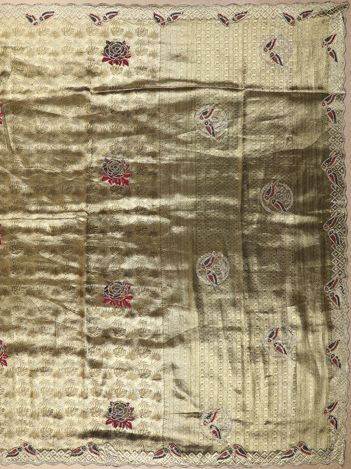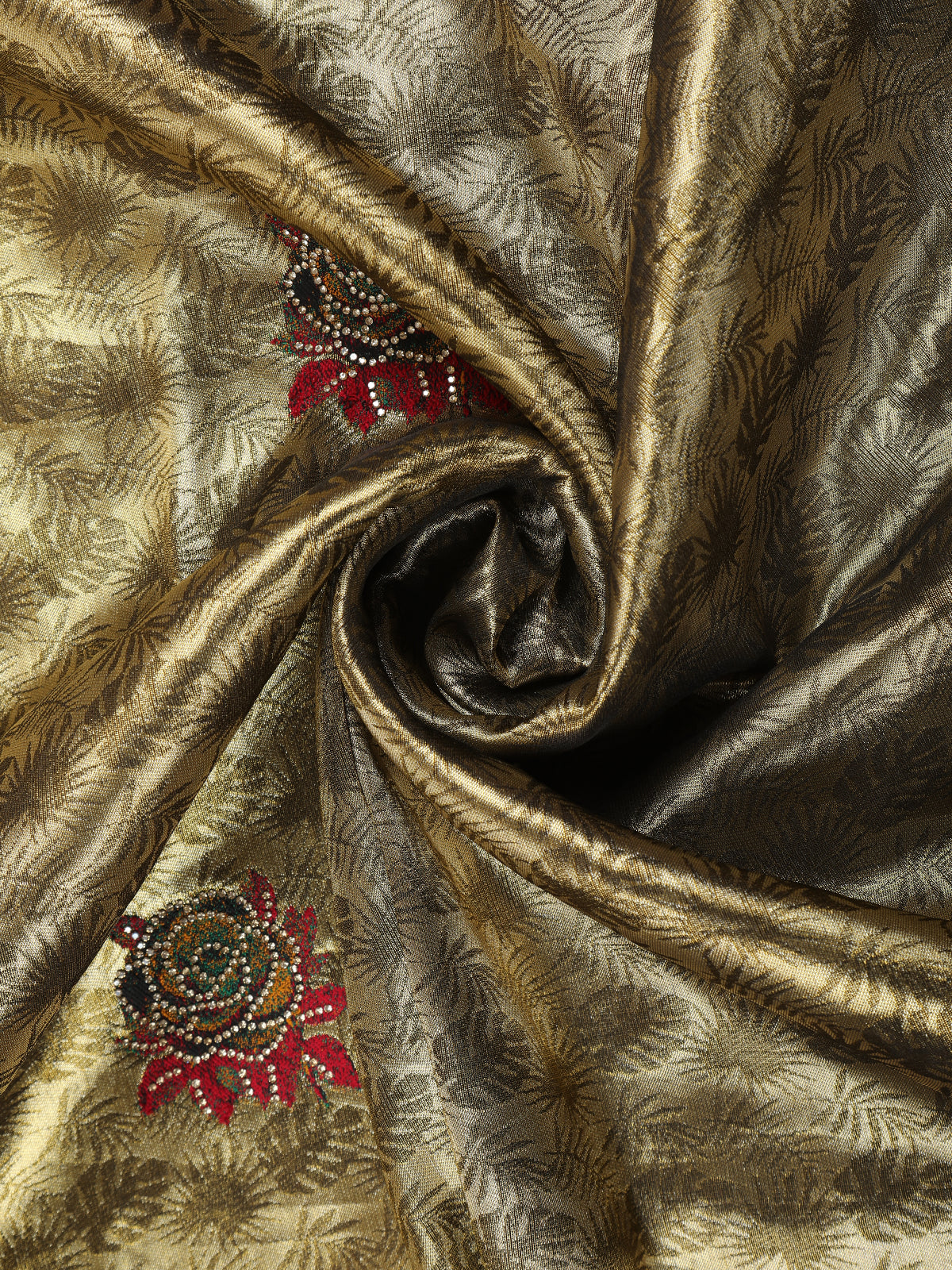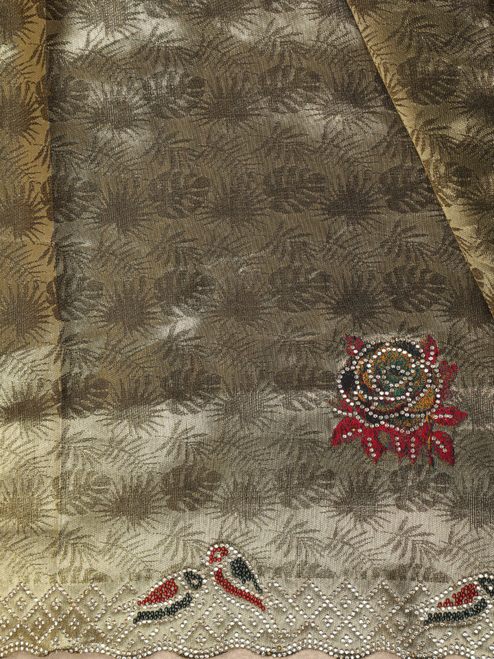 Metallic Olive Green Banarasi Silk Saree with Embroidered Floral Motifs and Designer Border