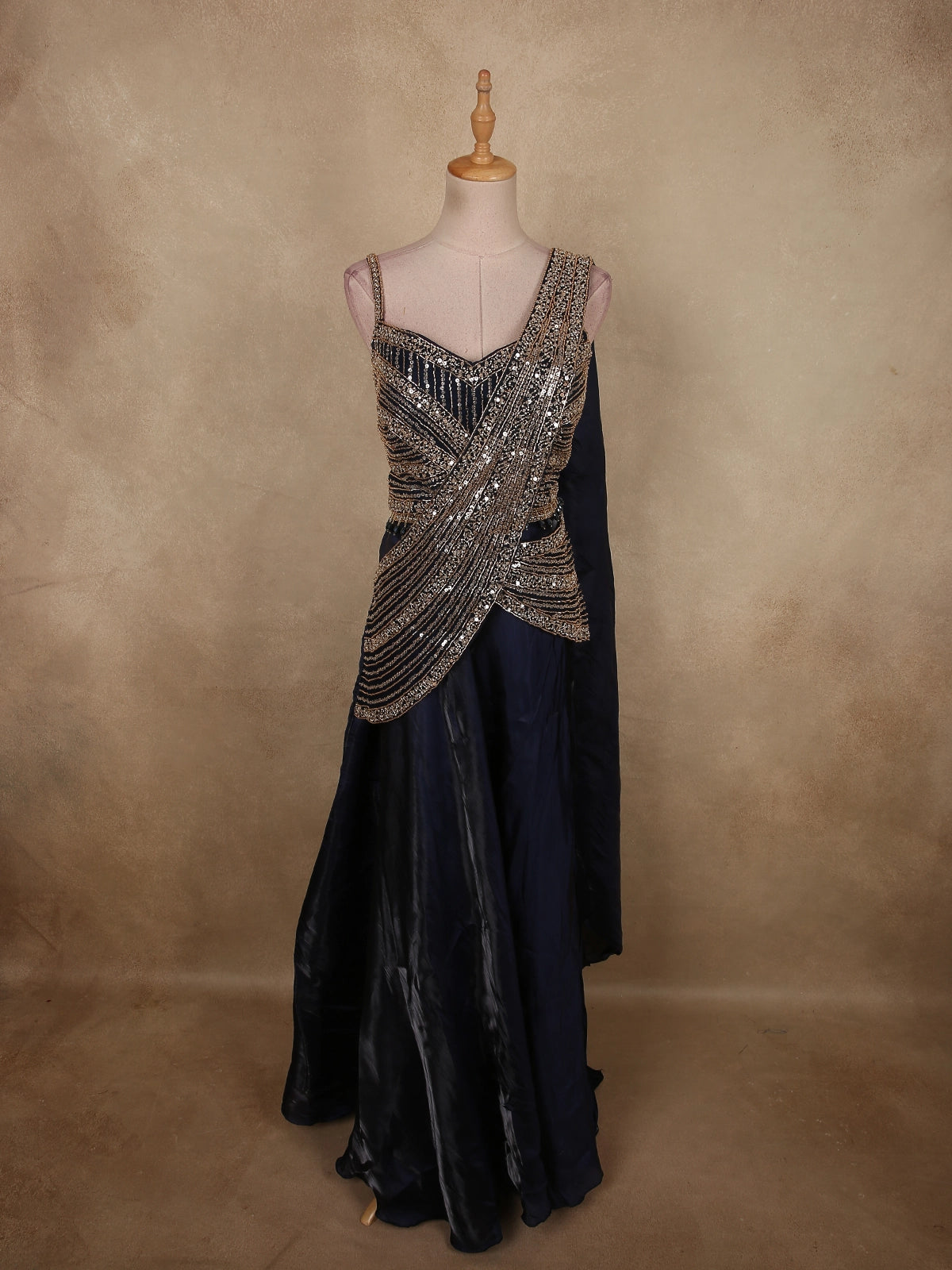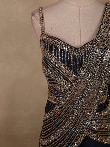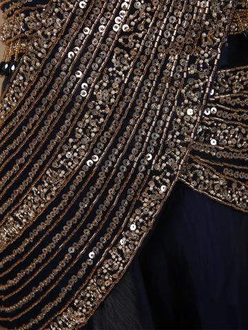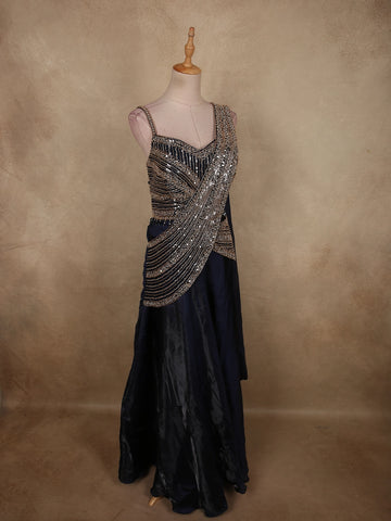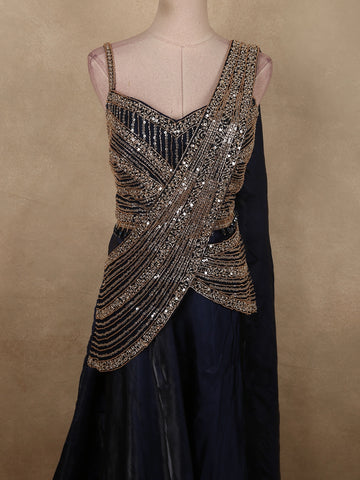 Midnight Navy Blue Heavy Sequin and Beads Embroidered Design Organza Lehenga with Attached Dupatta