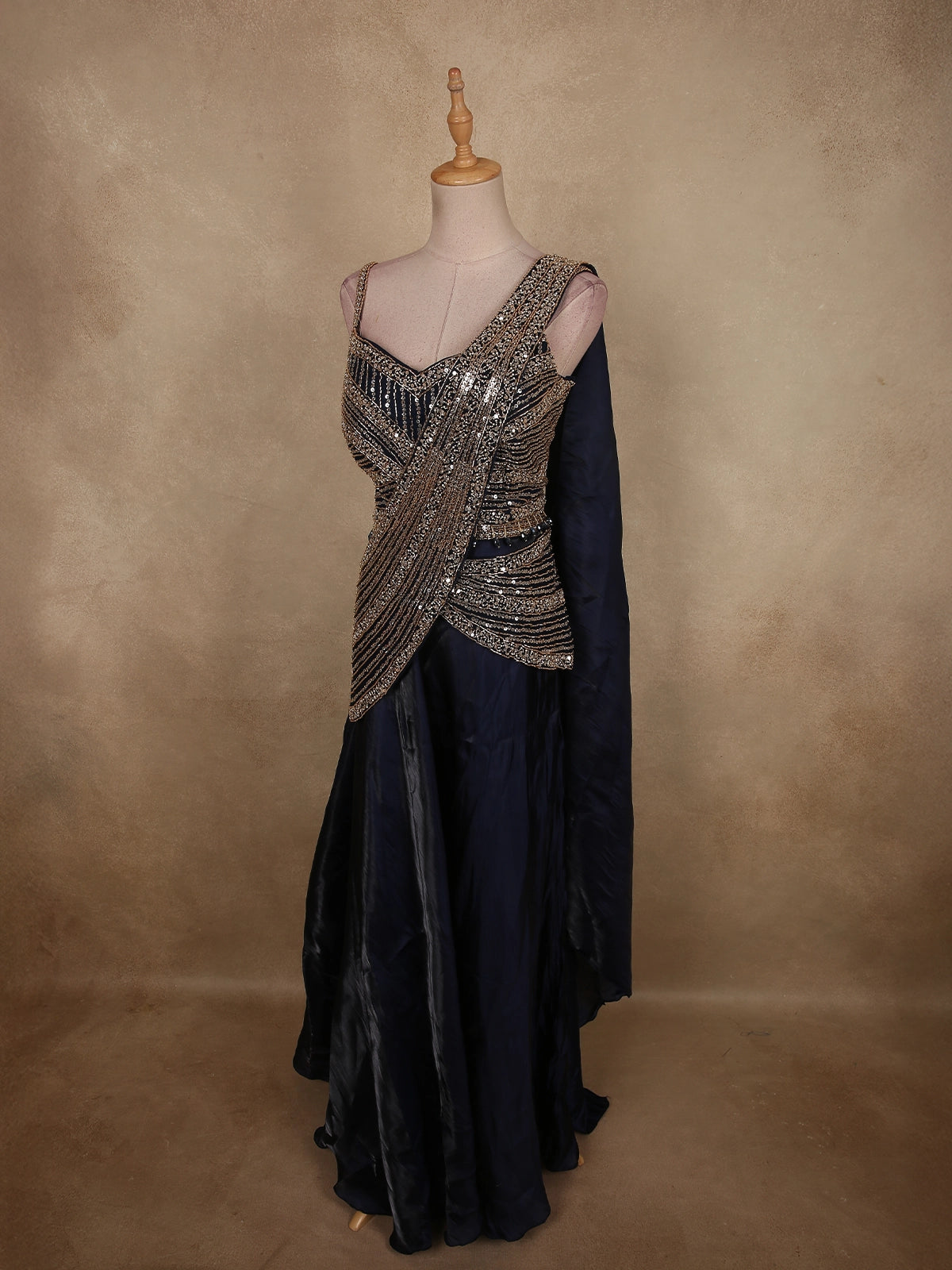 An attached dupatta-style drape adorned with coordinated sequin and bead embroidery cascades beautifully across the torso, adding a contemporary twist to traditional lehenga styling. This fusion detail enhances the overall grandeur while ensuring effortless elegance.