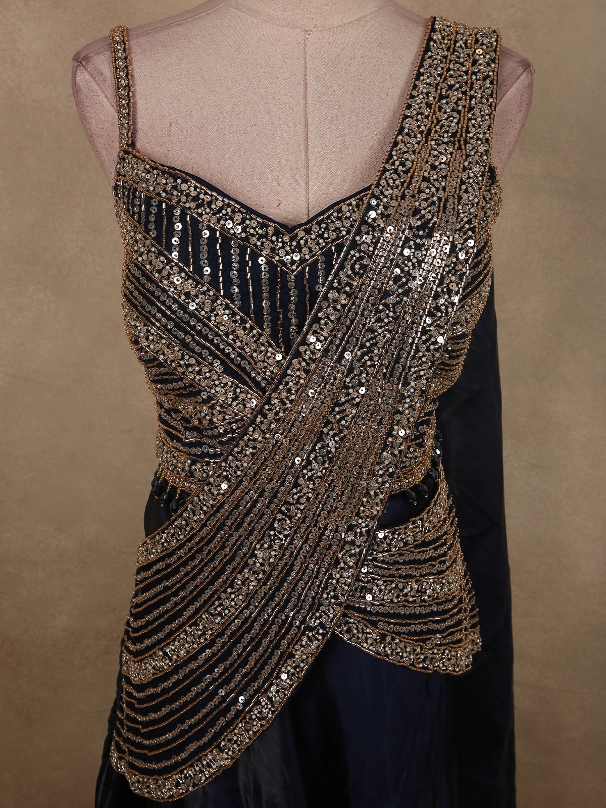 The blouse features intricate geometric and linear sequin detailing arranged in a structured, draped pattern across the bodice. Designed with elegant shoulder straps and a flattering neckline, the blouse showcases dense hand-embellished work that creates a sculpted, couture-inspired look. The shimmering metallic accents add depth and glamorous texture to the ensemble.