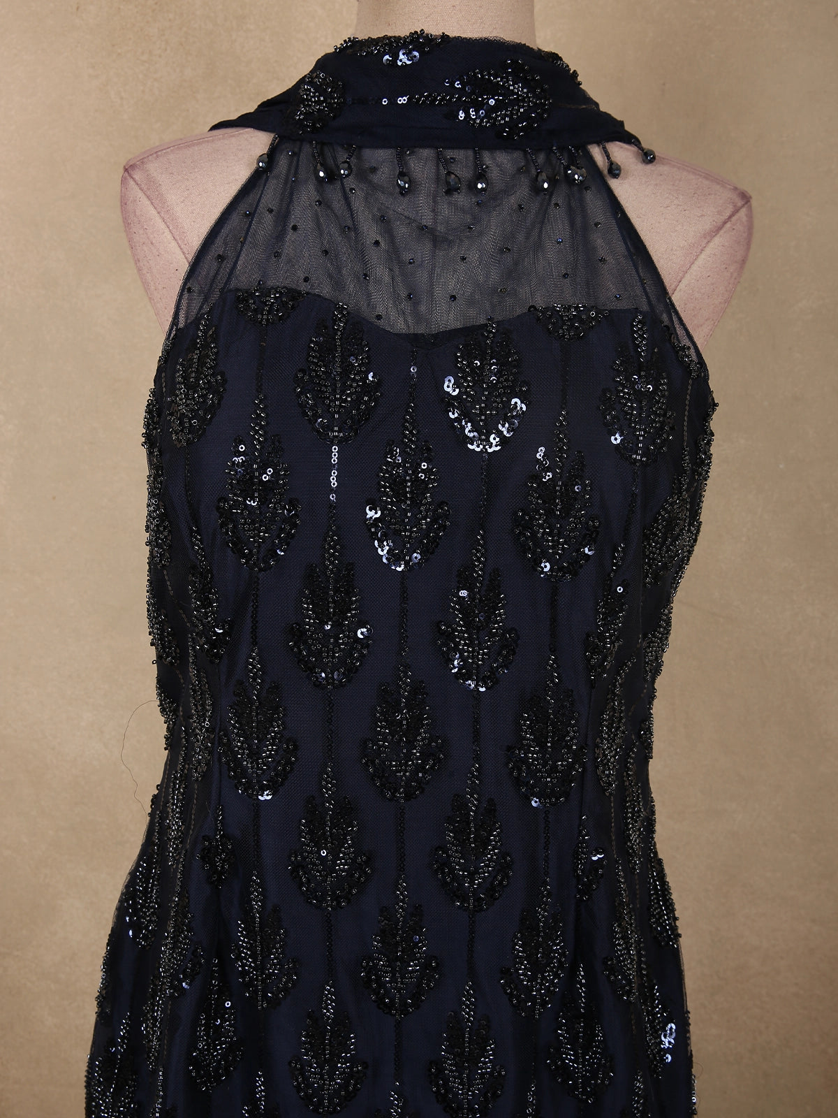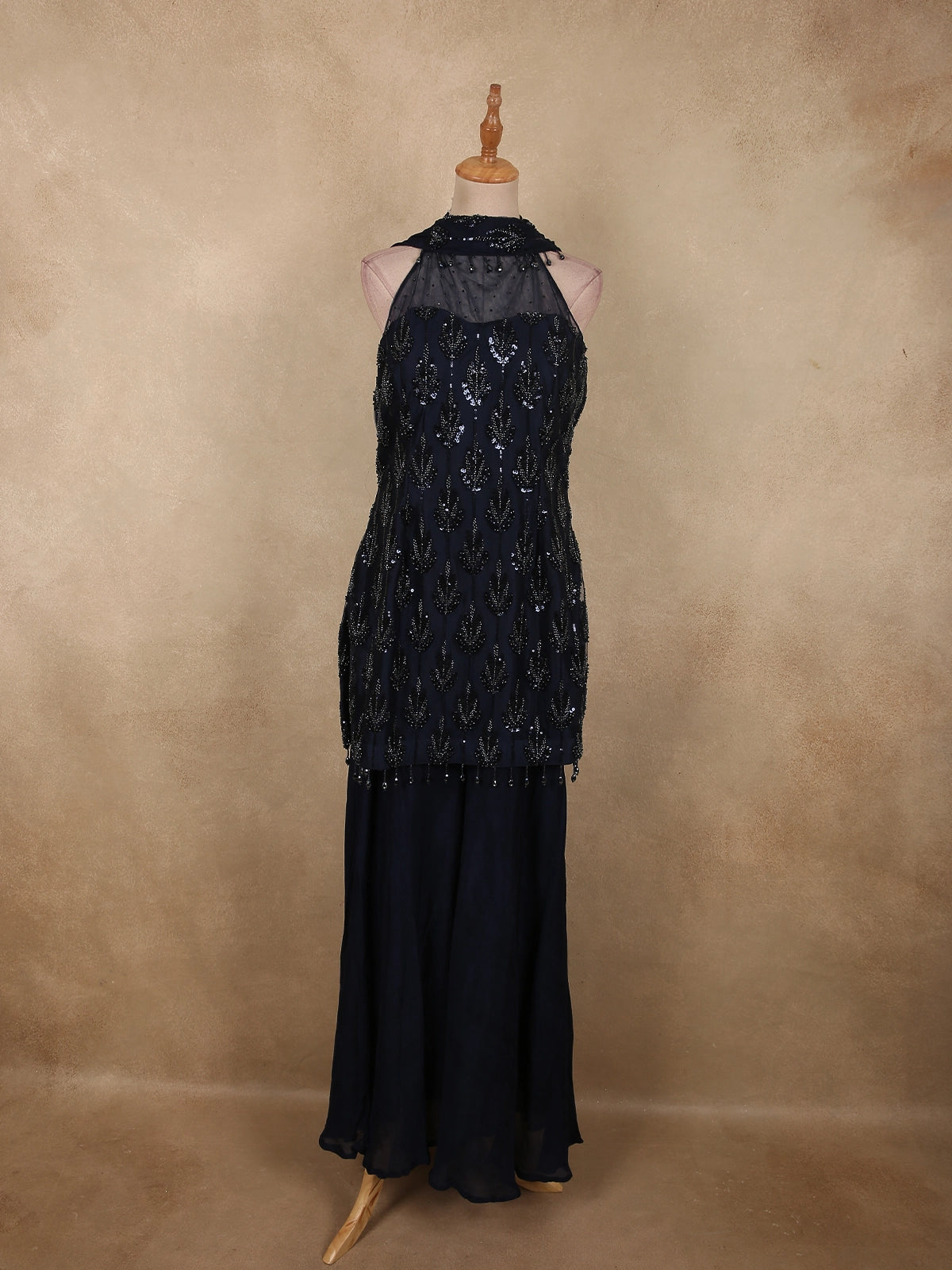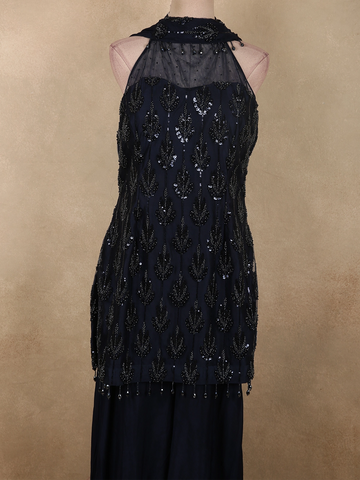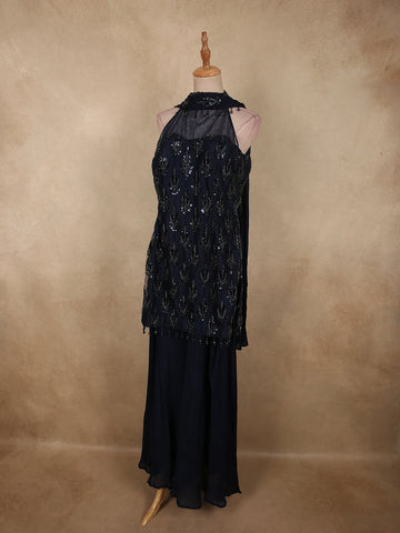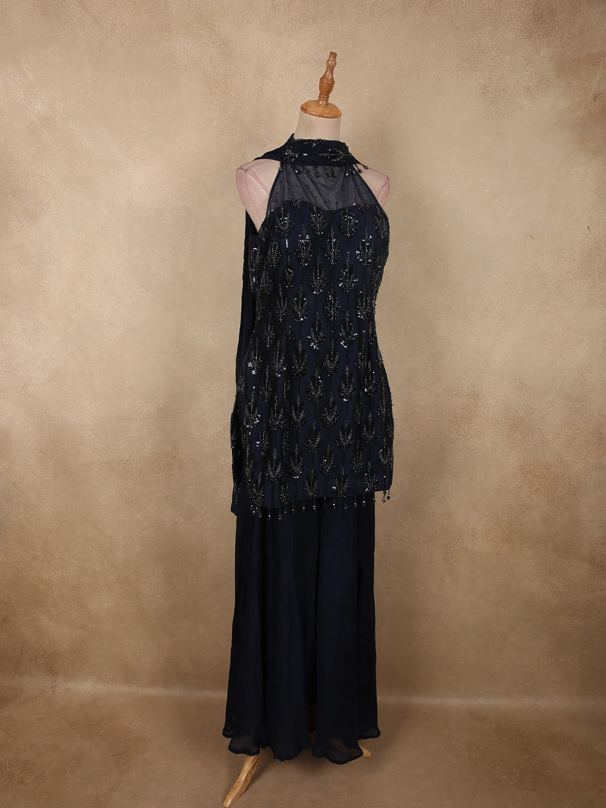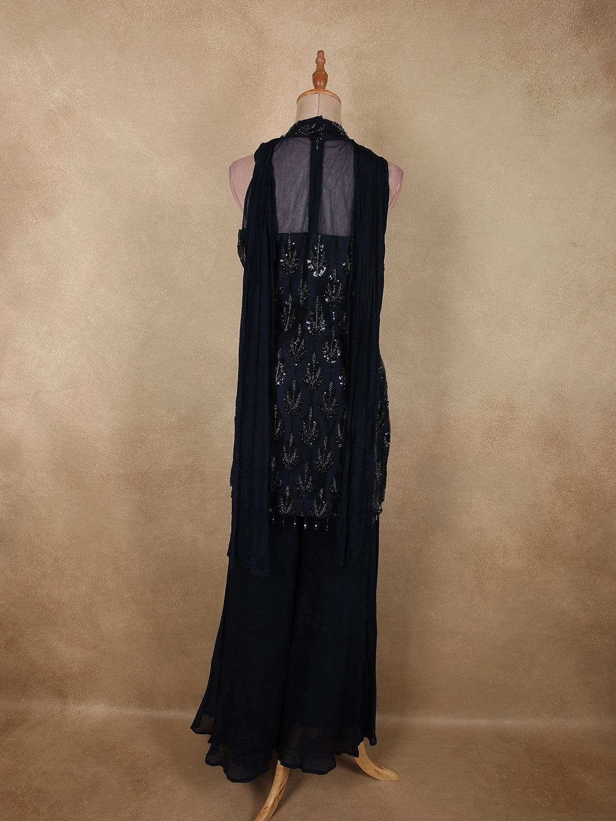 Midnight Navy Blue Heavy Sequins and Beads Embroidered Design Net Palazzo Suit With Dupatta