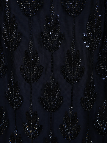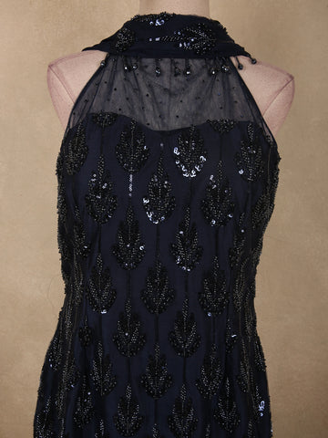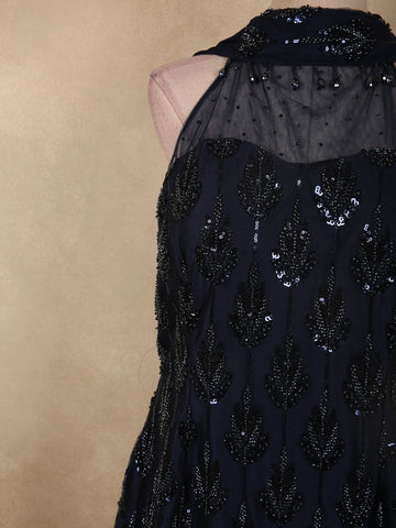 The sleeveless net kurta features heavy sequin and bead embroidery arranged in elegant vertical motifs that elongate the silhouette. The neckline is designed with a sheer illusion yoke and embellished collar detailing, adding a contemporary touch while maintaining classic charm. The delicate shimmer of sequins against the dark base creates a captivating evening-ready glow.
