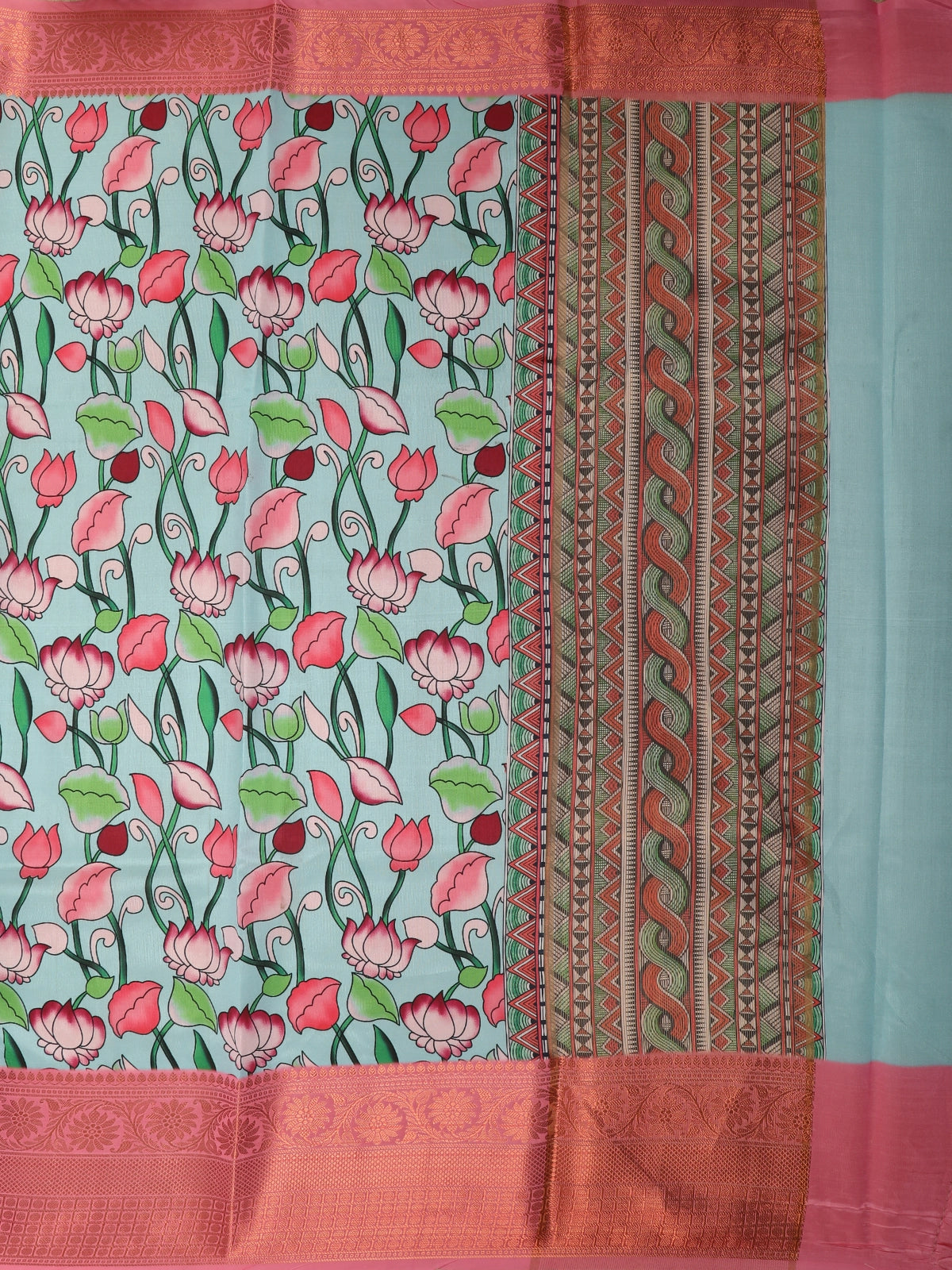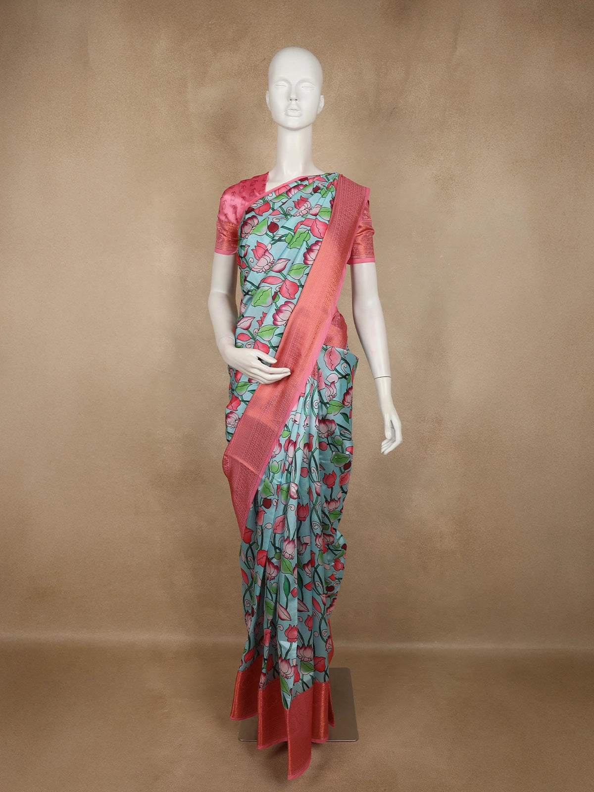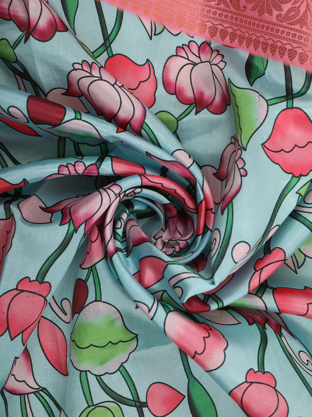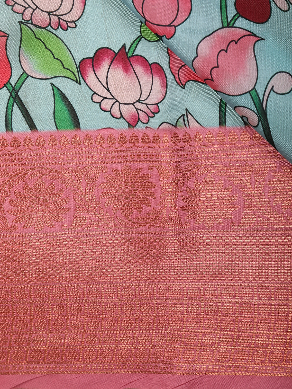 Woven in smooth art silk, the saree offers a gentle sheen and a lightweight, fluid fall, ensuring effortless comfort throughout the day. The look is further elevated by a dusty rose pink zari-woven border and a matching pallu, adding a refined traditional touch to the modern floral aesthetic. Paired with a coordinated pink blouse, this saree is perfect for festive celebrations, casual weddings, daytime functions, and elegant gatherings, delivering a graceful statement with understated luxury.