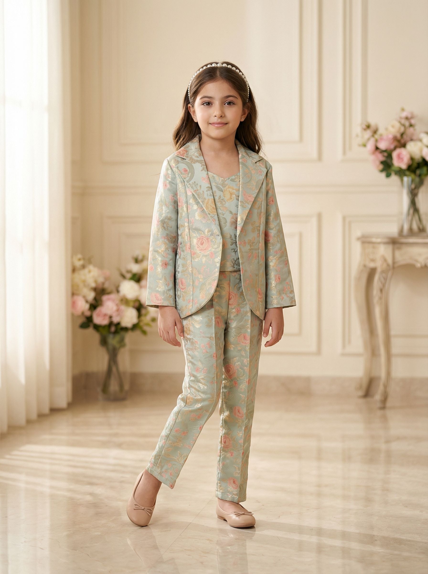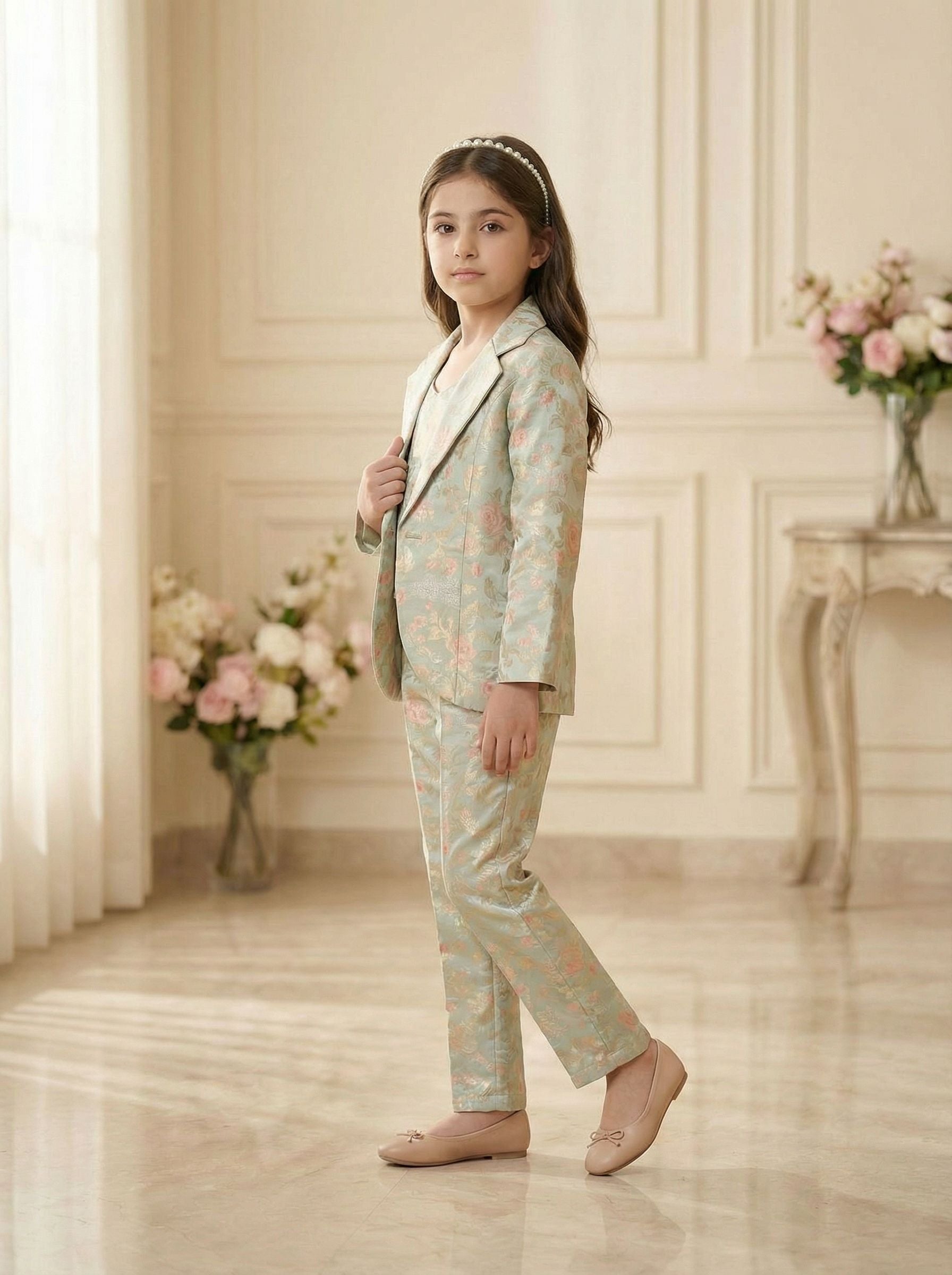 Mint Green Coat Suit with Floral Prints