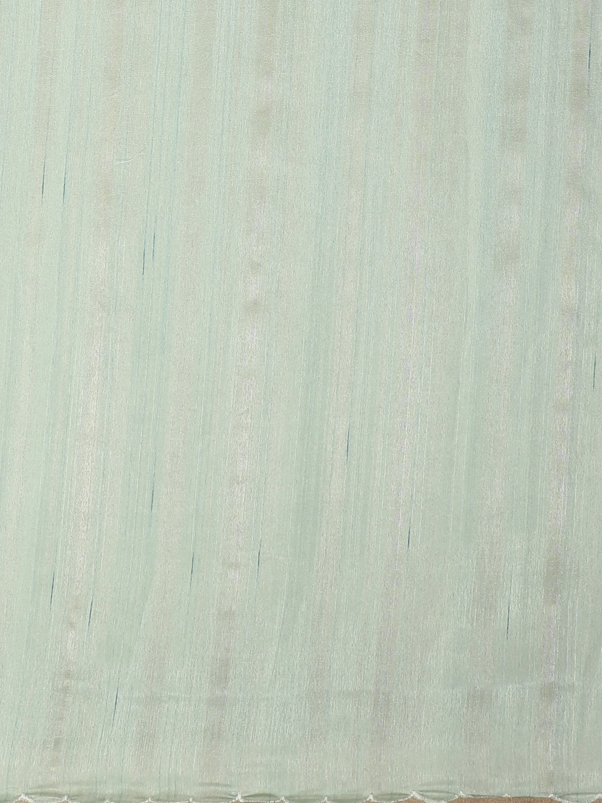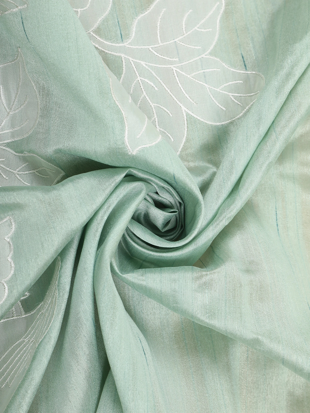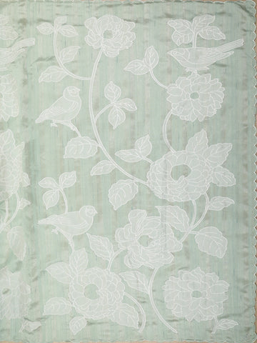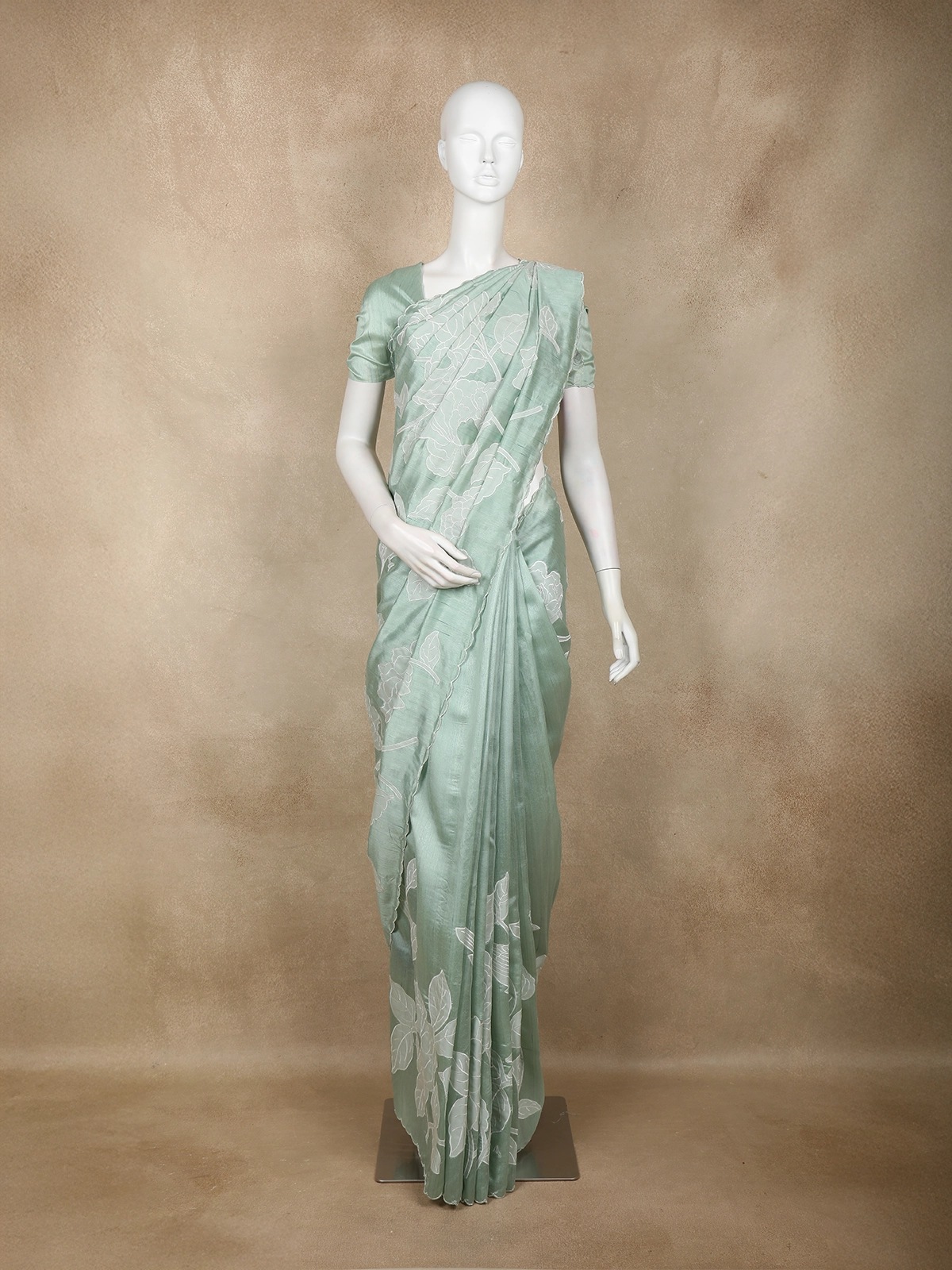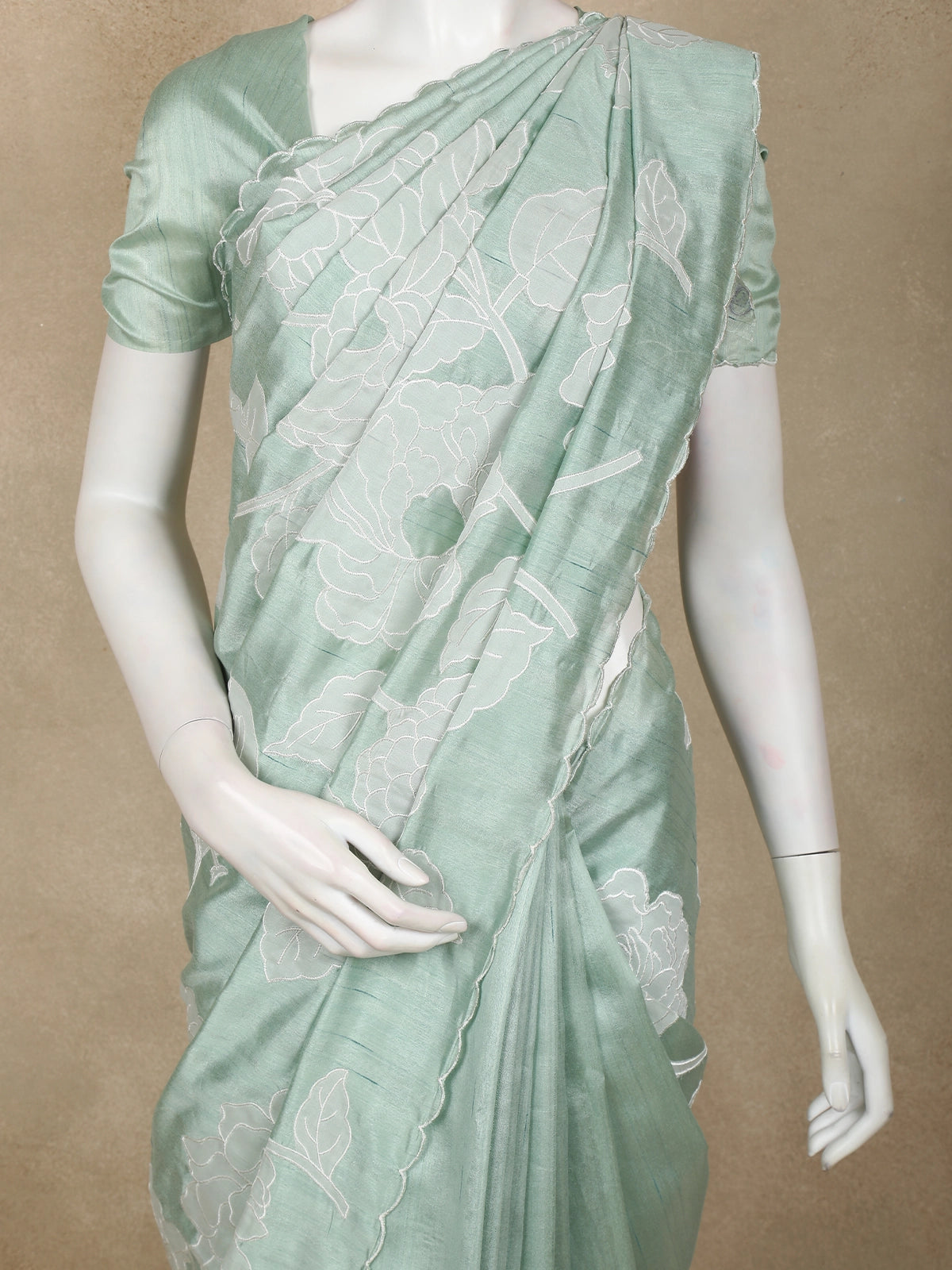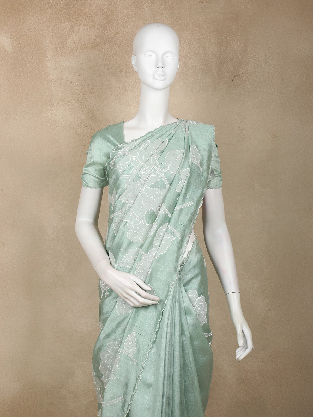 Elevate your elegance with this serene Mint Green Floral Design Tussar Saree with Applique Work, crafted to bring together timeless artistry and soothing contemporary aesthetics. The luxurious tussar silk drapes beautifully with a soft, refined sheen, making it a perfect choice for graceful daytime occasions and intimate celebrations.