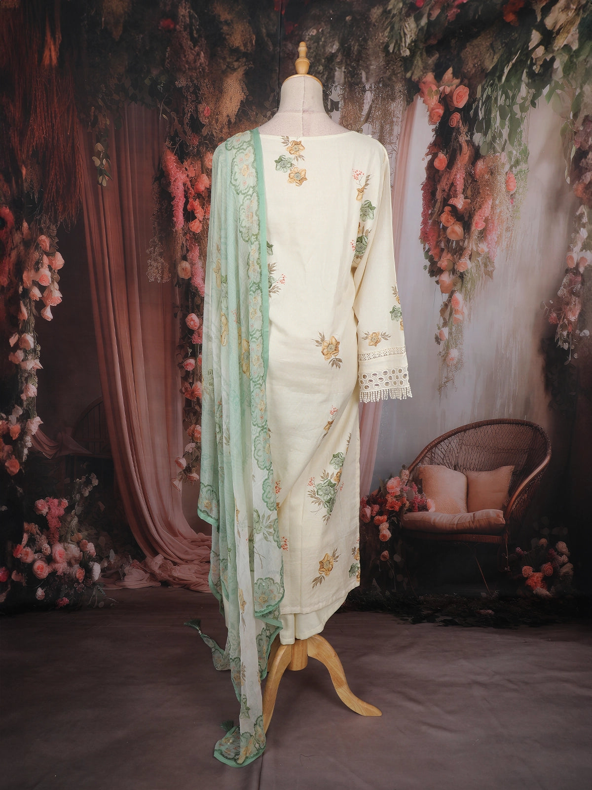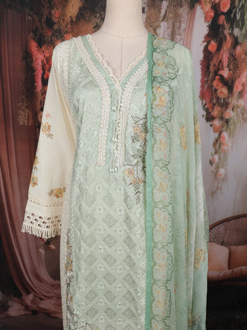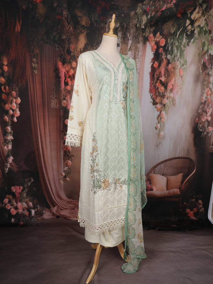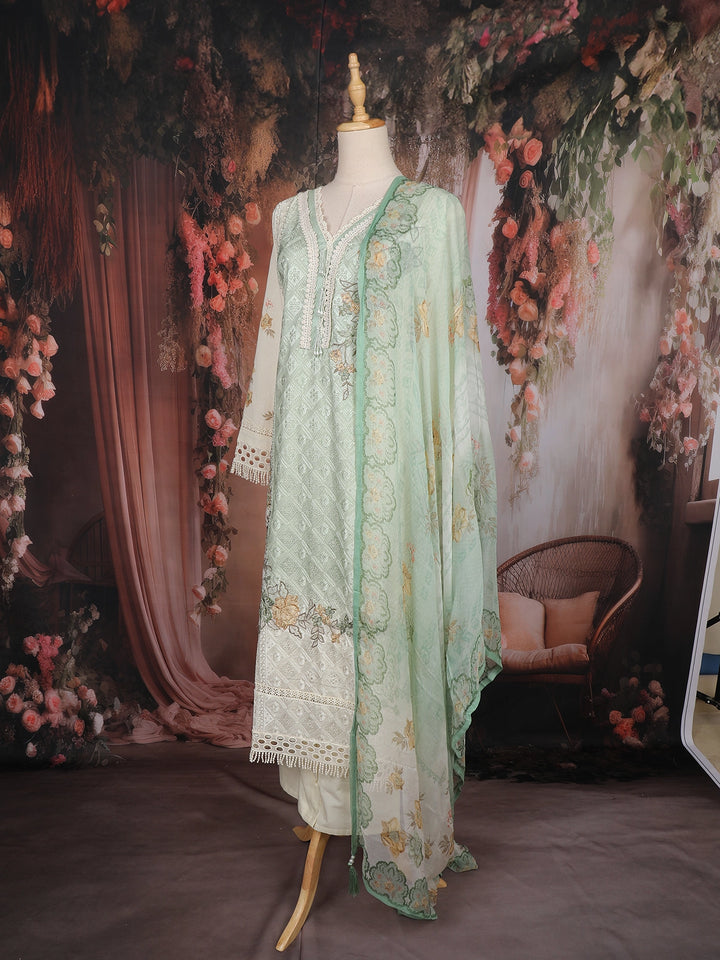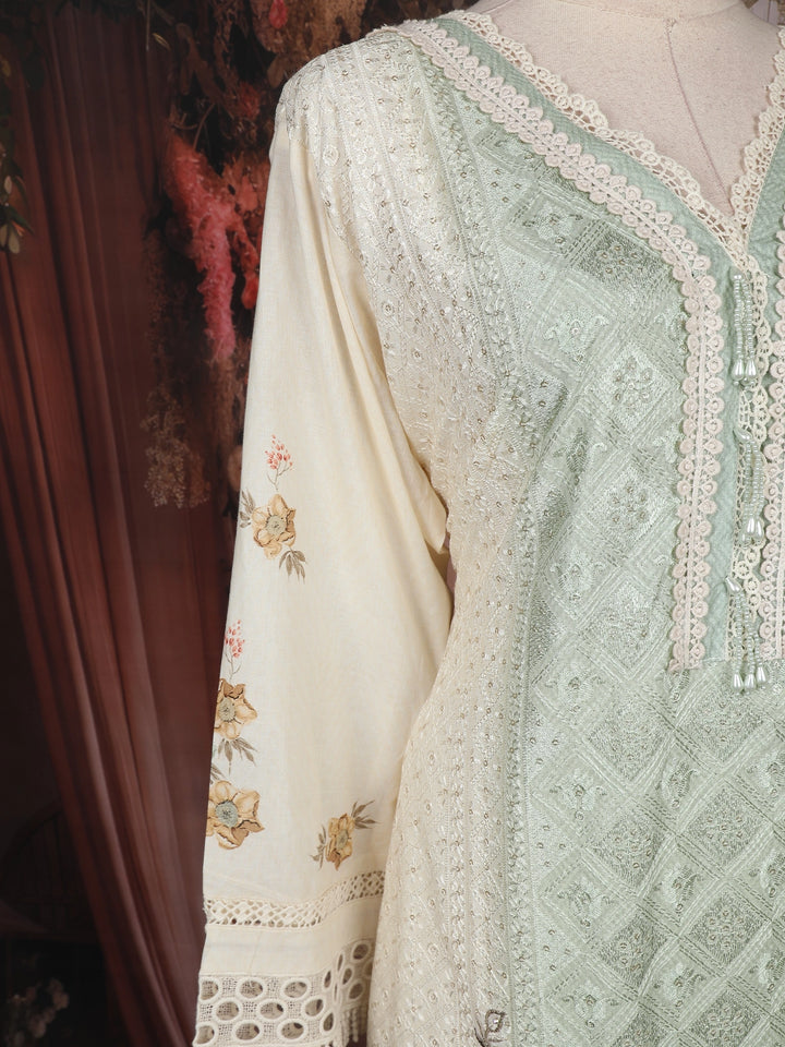 The kurta showcases a V-neckline adorned with lace borders, 3/4 embroidered sleeves, and a scalloped hemline that exudes refined charm. The pastel mint green hue complements all skin tones, while the subtle floral motifs add a touch of grace. The outfit is completed with a matching chiffon dupatta featuring floral prints and lace-trimmed edges, along with a contrasting cream-colored bottom for a polished finish.