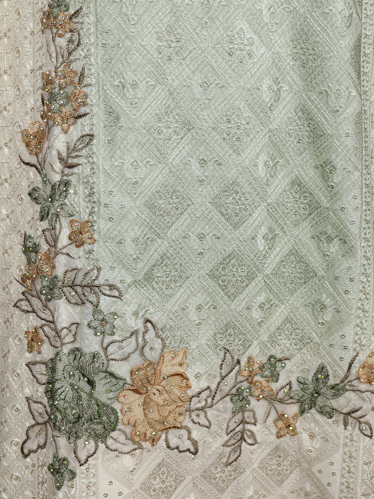 Infuse your wardrobe with soft sophistication through this Mint Green Floral Embroidered Cotton Salwar Suit with Dupatta, a piece that beautifully combines elegance and comfort. Crafted from premium quality cotton fabric, the ensemble features intricate floral embroidery with delicate thread and lace detailing, giving it a timeless appeal perfect for festive and semi-formal occasions.
