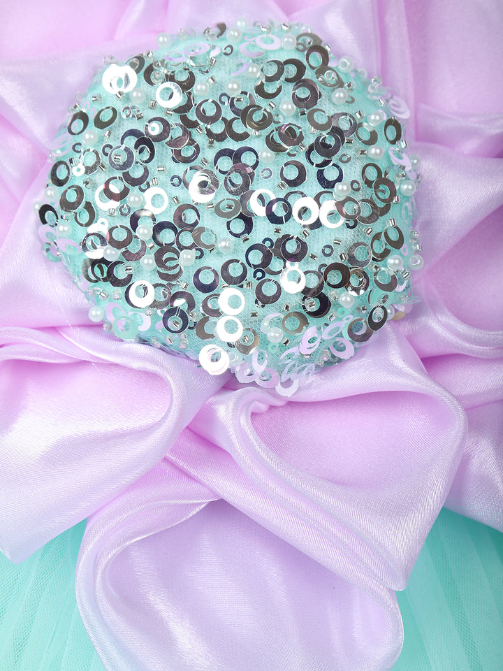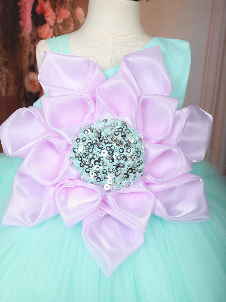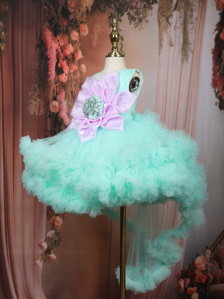 Let your little one sparkle like a star in this stunning Mint Green Floral Layered Net Ruffle Frock, crafted to bring out her inner princess. The frock features a captivating oversized 3D floral appliqué at the bodice, artistically designed with satin petals and a shimmering sequin-embellished centerpiece, adding a touch of glamour and uniqueness to the outfit.