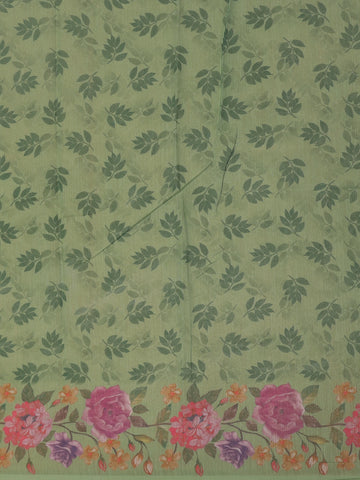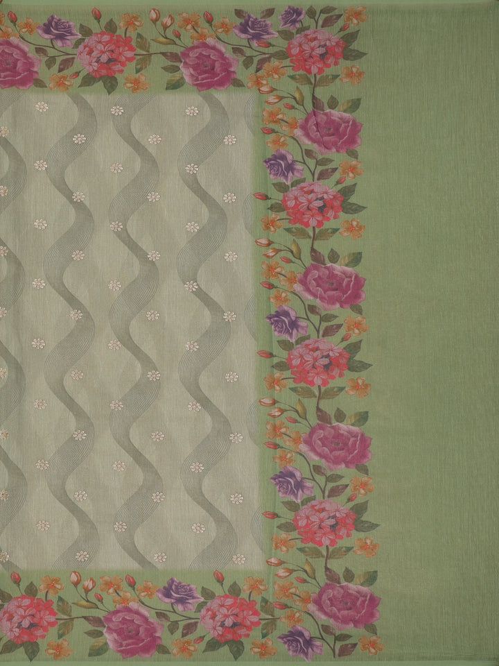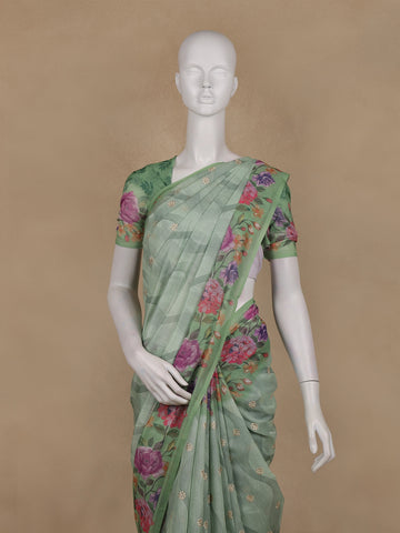 The body features vibrant floral prints in soft tones of pink and purple, creating a refreshing and sophisticated aesthetic. The matching pallu and blouse in mint green maintain harmony throughout the design, while the zari border adds a touch of regal shimmer, making it ideal for festive gatherings and daytime celebrations.