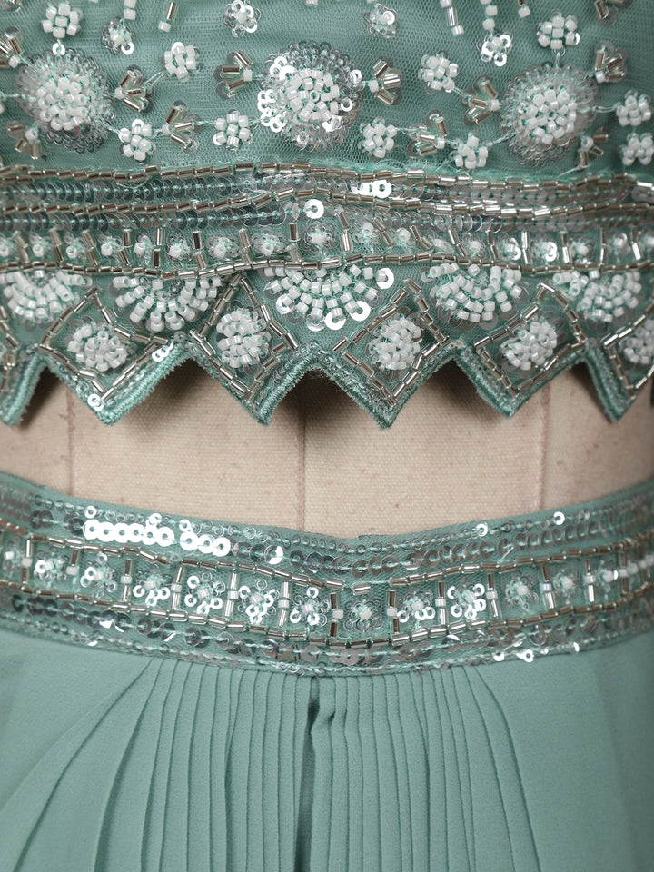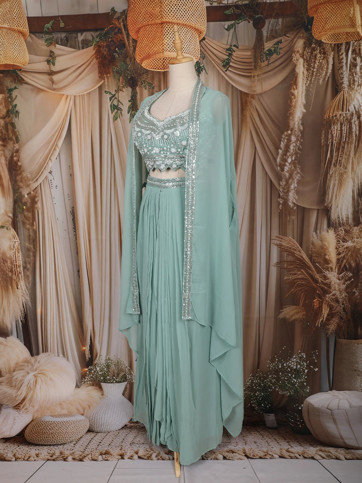 Mint Green Mirror Embroidered Design Georgette Skirt Top with Cape Jacket