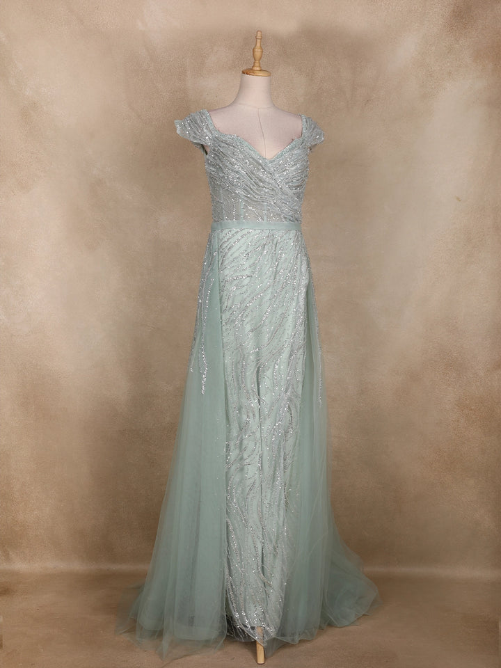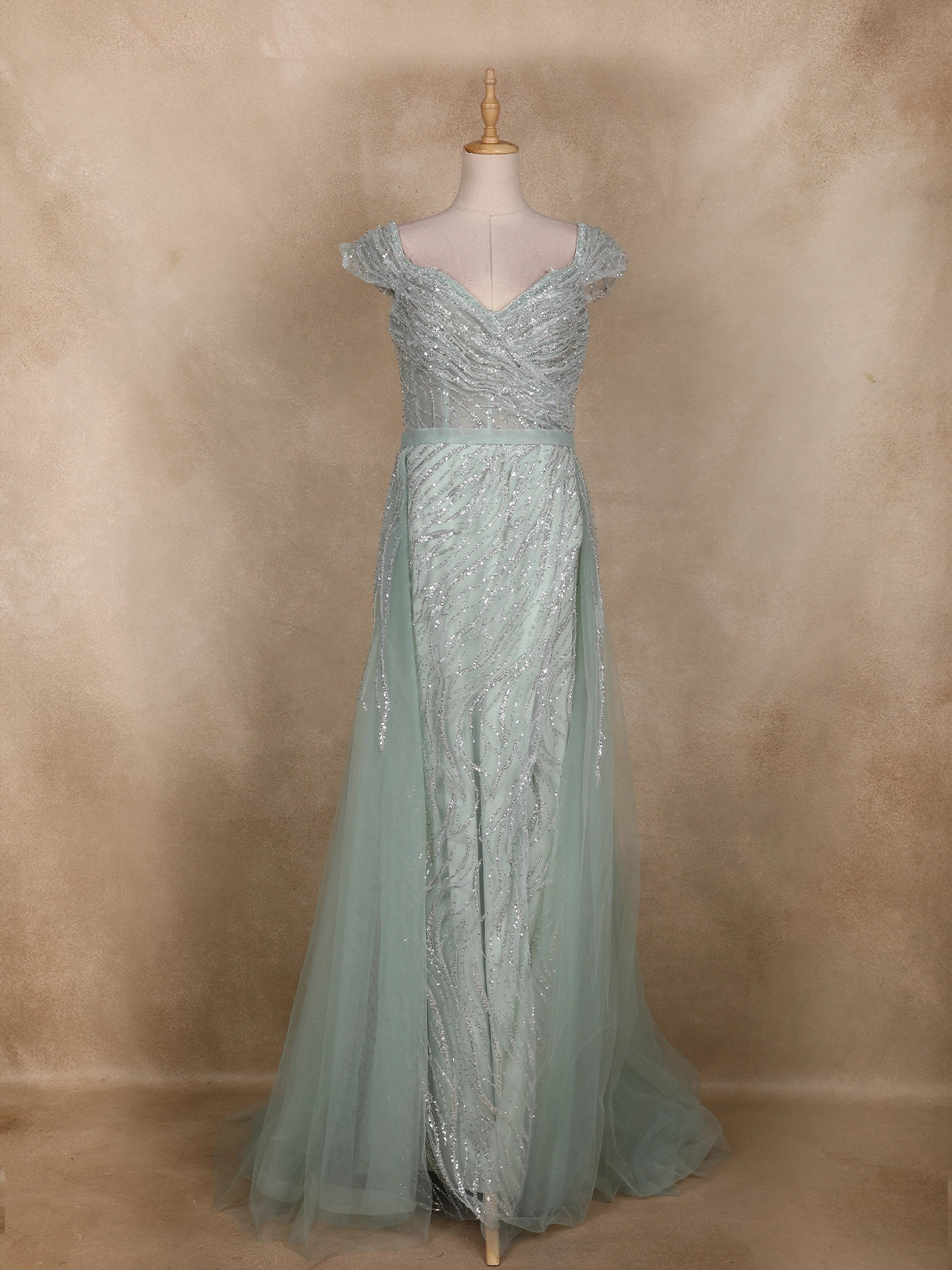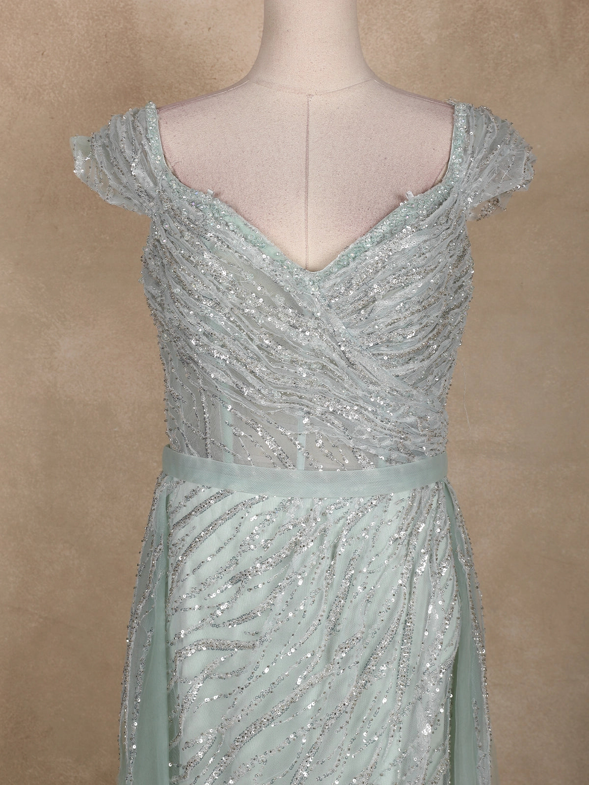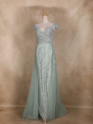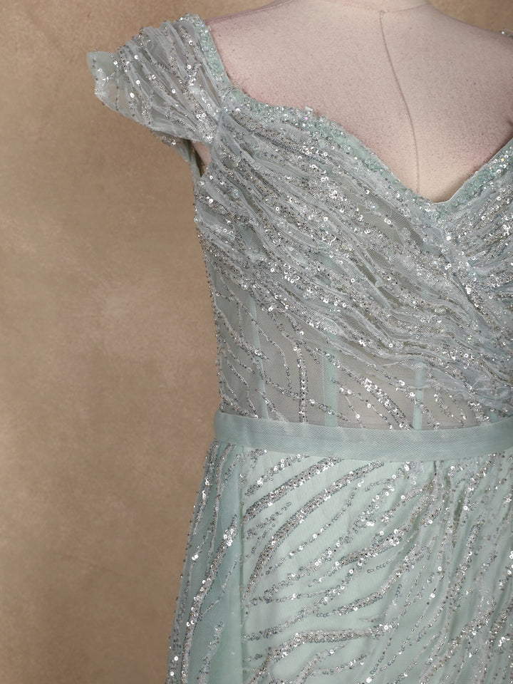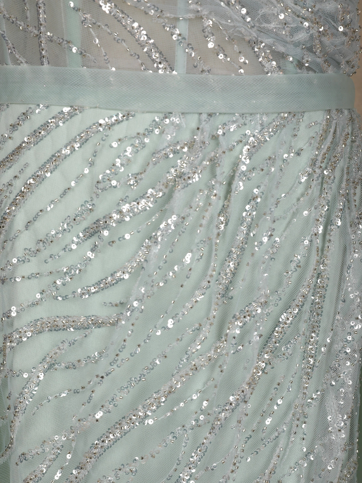 Step into timeless elegance with this ethereal mint green gown crafted from delicate net fabric. The ensemble showcases an exquisite display of shimmering sequins embroidery arranged in graceful wave patterns throughout, exuding understated glamour. The overlapped V-neck bodice with soft cap sleeves creates a flattering silhouette, while the sheer net overlay adds a dreamy, flowy charm. A satin waistband cinches the waist beautifully, leading into a floor-length flared hemline with a semi-train for that perfect red-carpet flair. The gown’s subtle pastel hue paired with its glittering detailing makes it ideal for evening galas, receptions, and cocktail events.