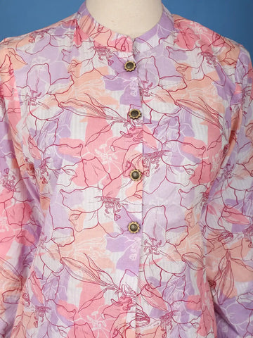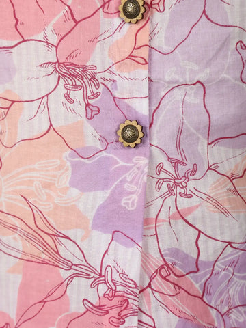 Bring a touch of freshness to your everyday style with this multi-color floral printed cotton co-ord set. Designed in soothing pastel shades of pink, peach, and lavender, the set exudes a soft and feminine charm. The top features a smart Chinese collar, stylish 3/4 sleeves, and a row of antique finish buttons that add a hint of elegance to its simple silhouette. Paired with relaxed wide-leg pants in the same floral print, this outfit blends comfort with sophistication.