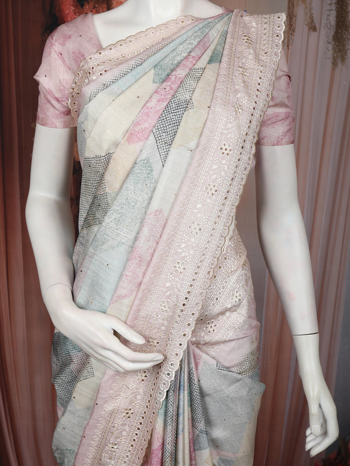 The saree is further enhanced with a delicately embroidered lace border, adding a touch of luxury and intricate detailing that elevates its overall appeal. Its lightweight Tussar-feel texture offers a graceful fall and comfortable wear, making it ideal for long celebrations or intimate events.