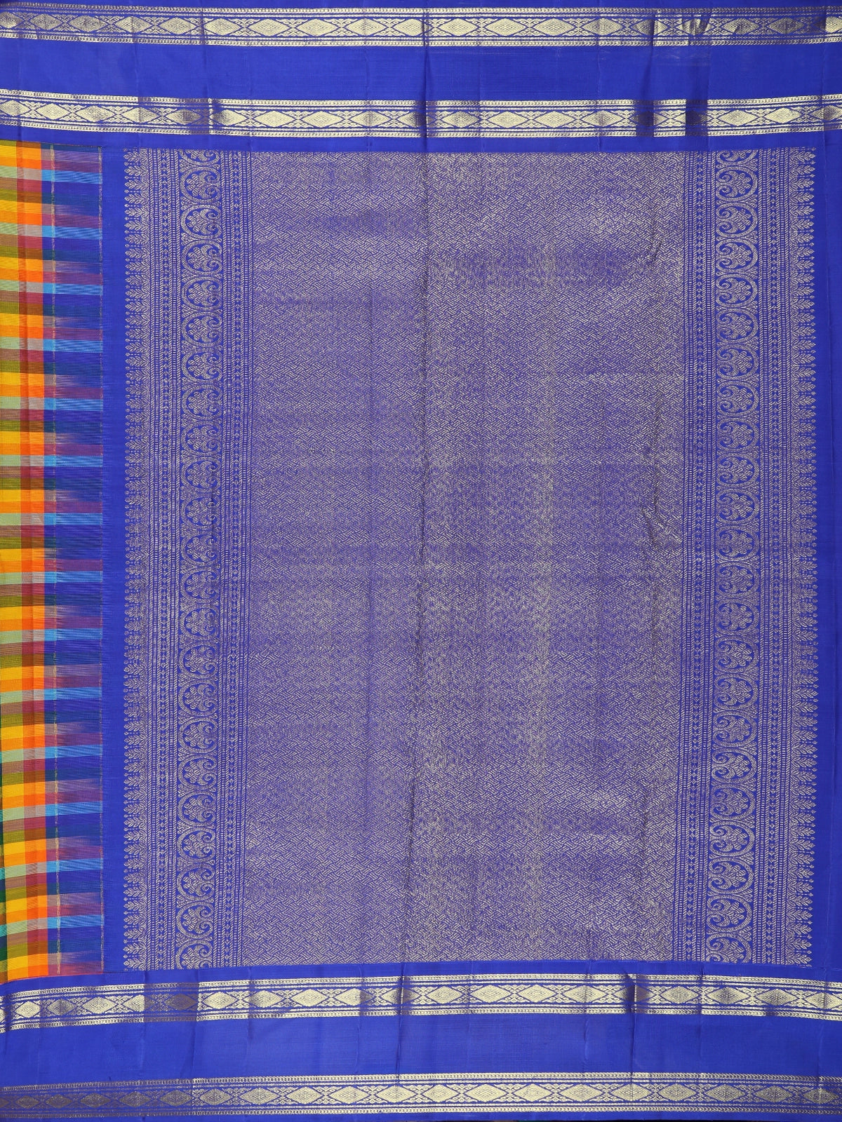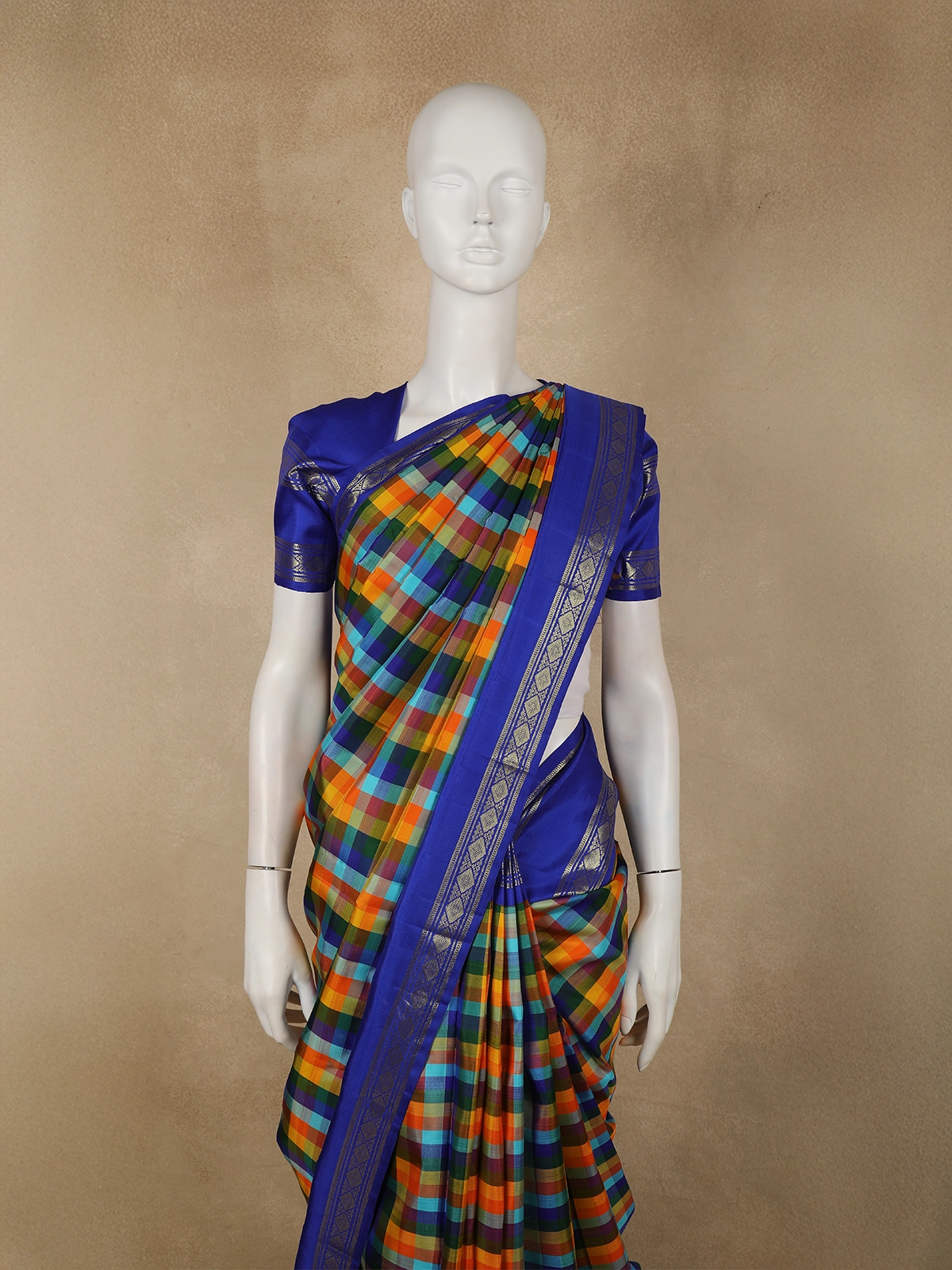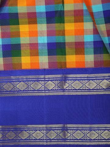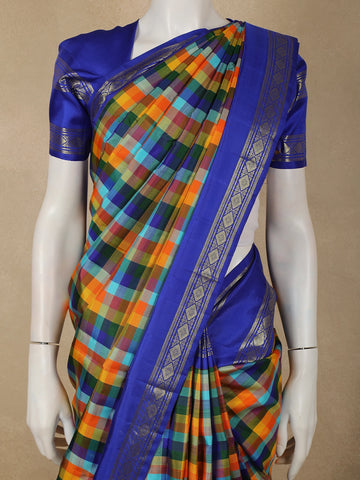 Overall, the combination of bold multicolor checks with a striking royal blue zari border gives this saree a joyful, energetic, and heritage-inspired appeal. It is an excellent choice for festivals, weddings, temple functions, and special occasions, especially for those who love expressive colors blended with classic craftsmanship.