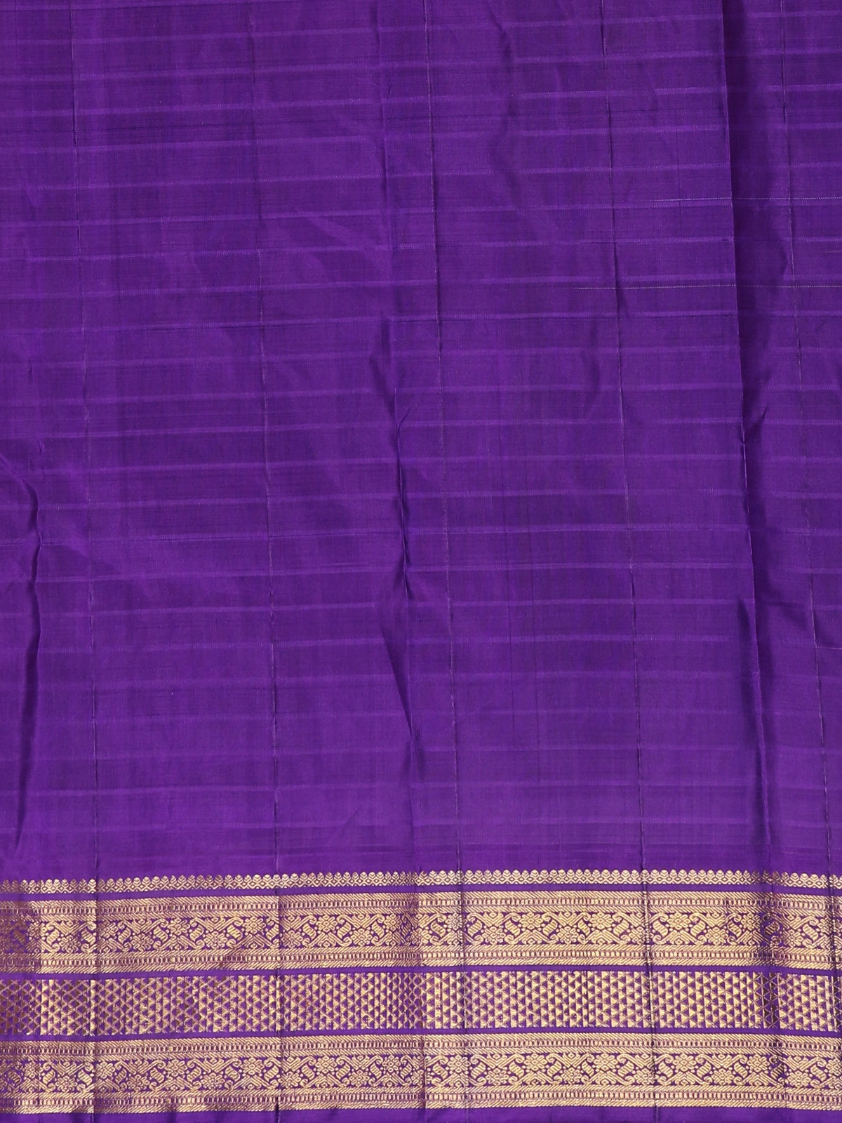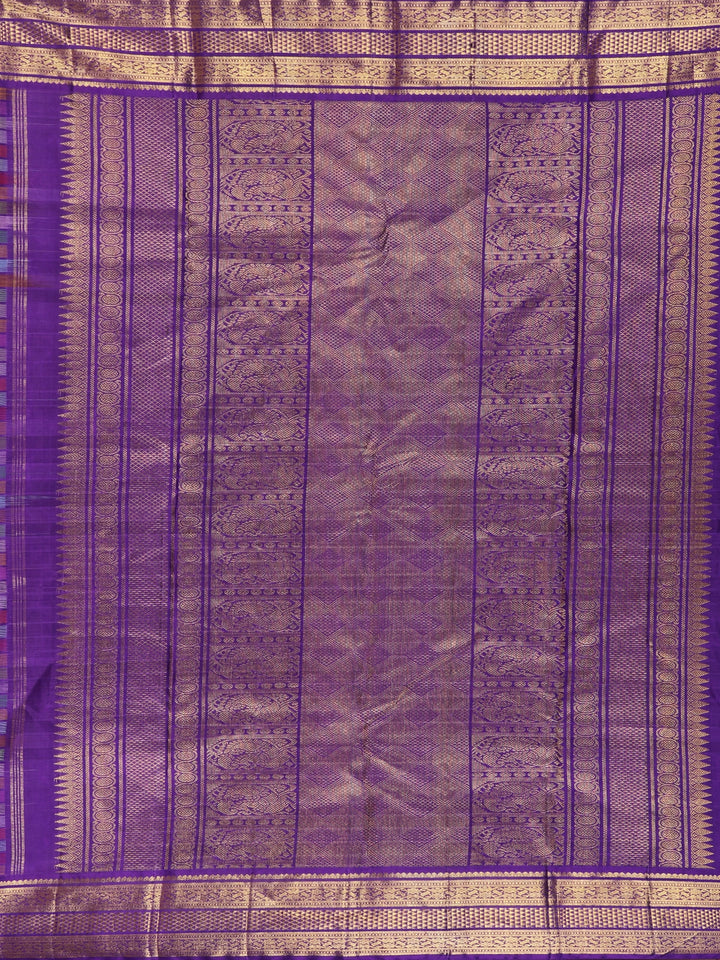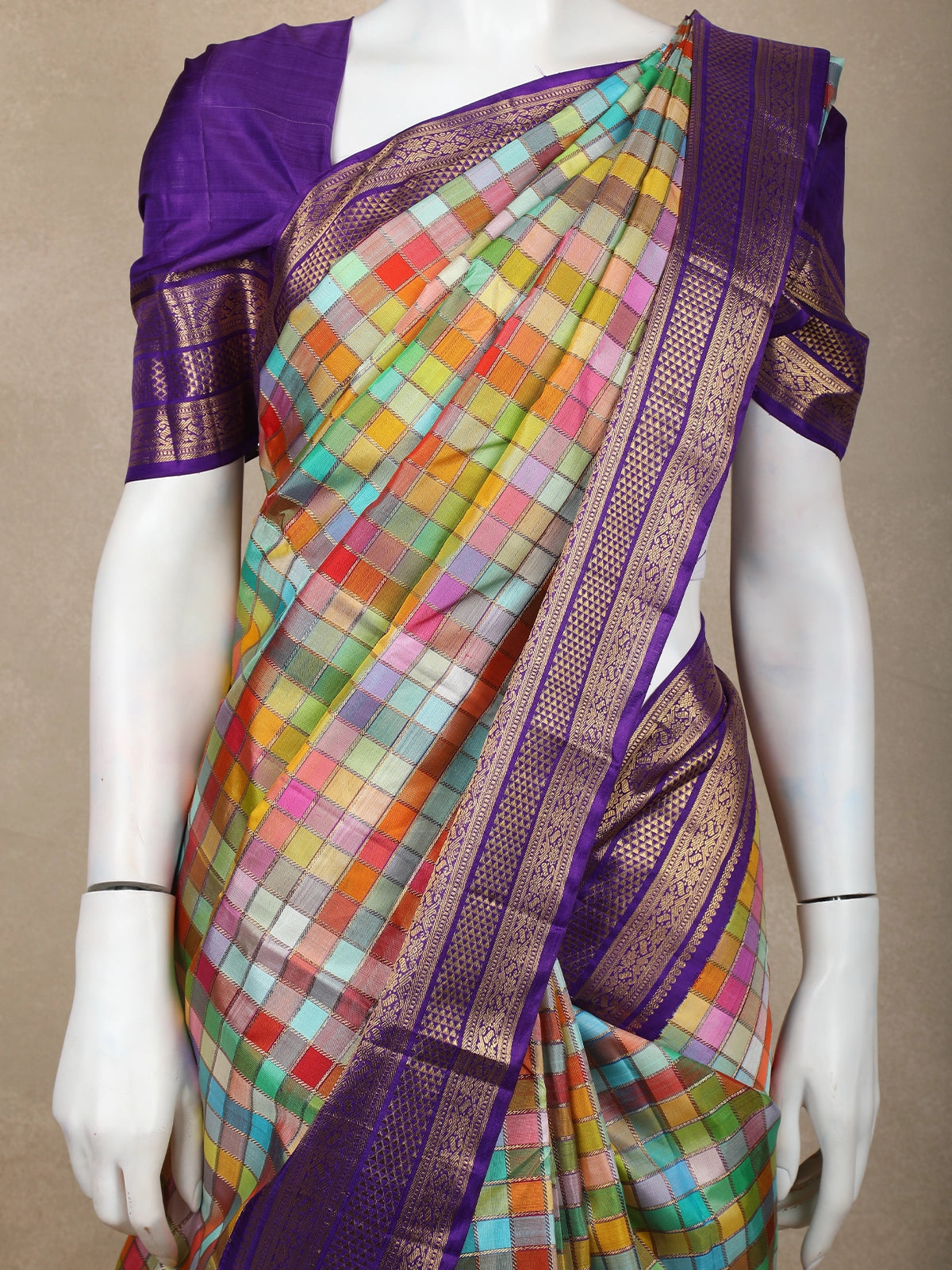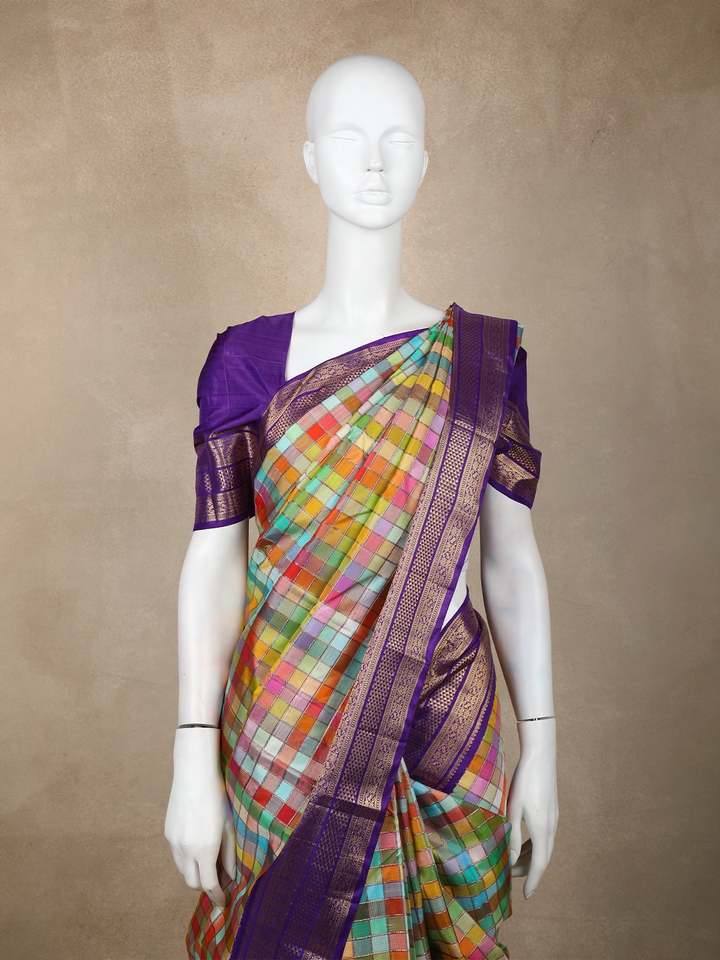 Multicolor Checked Woven Pure Kanchipuram Silk Saree with Contrast Purple Zari Border