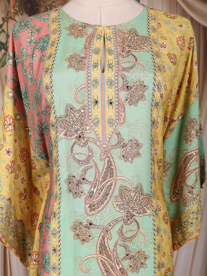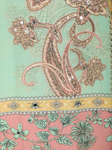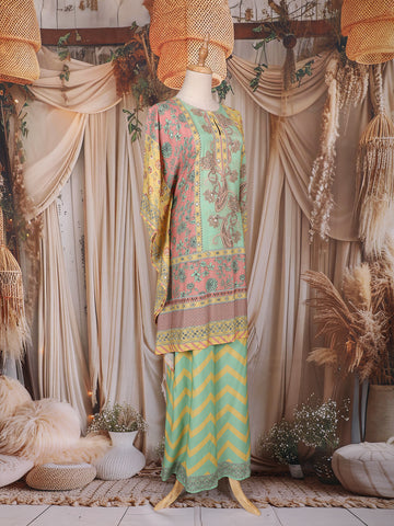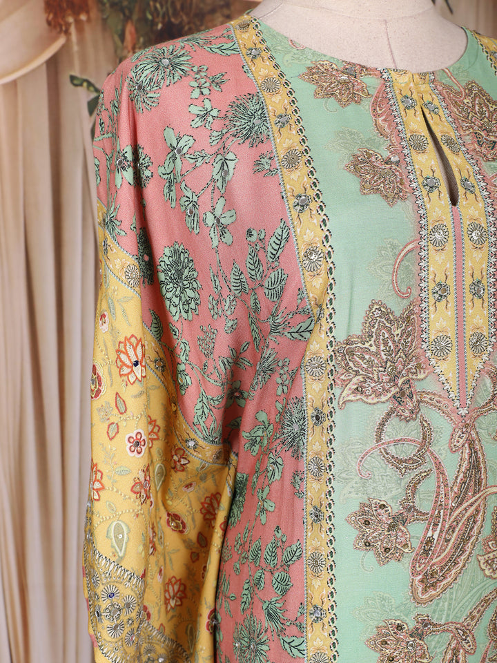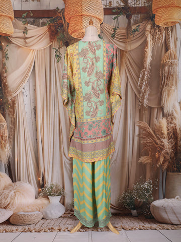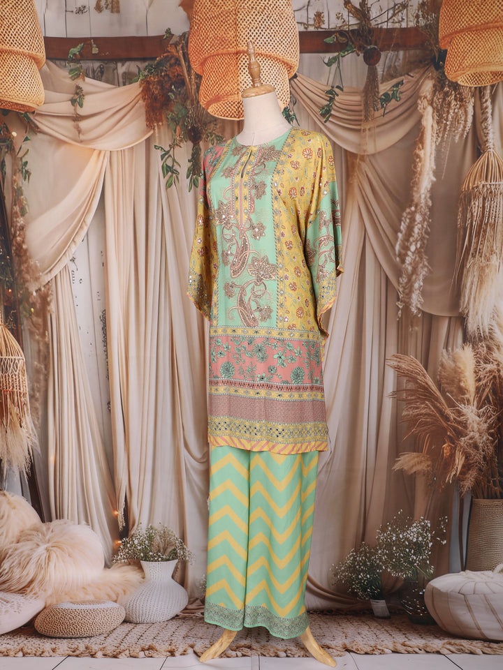 A breezy blend of comfort and elegance, this pastel-hued kaftan-style palazzo suit features a refreshing palette of mint green, peach pink, and mustard yellow. The kurta is adorned with intricate floral and paisley prints accentuated by delicate embroidery along the neckline and front panel. The wide, flowy sleeves add to the airy charm, while the chevron-patterned palazzo in green and yellow enhances the contemporary appeal. Perfect for festive gatherings and daytime events, this ensemble blends traditional prints with a modern silhouette.