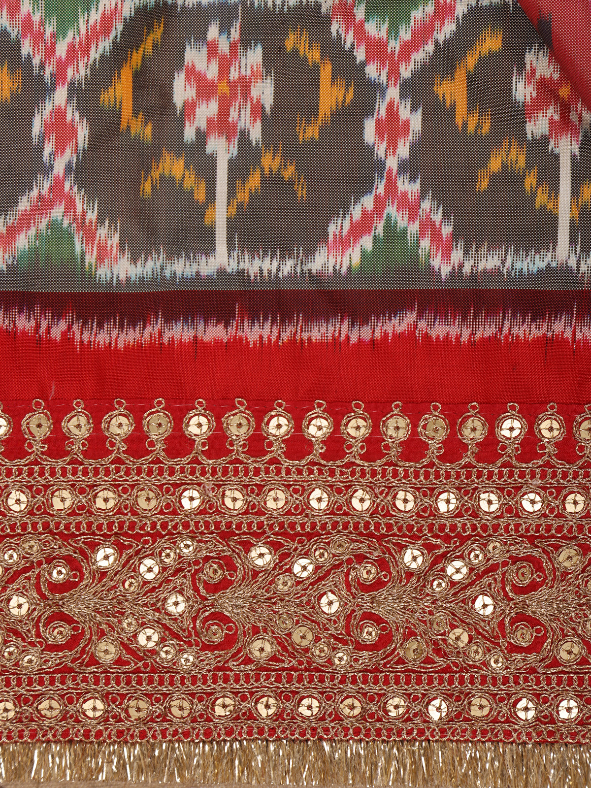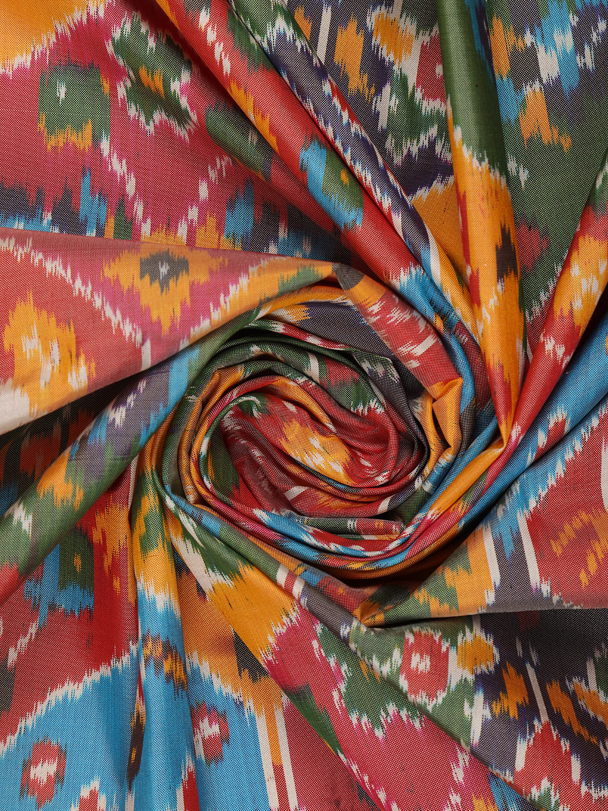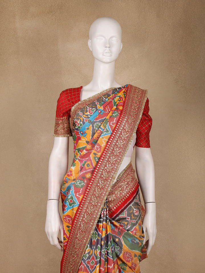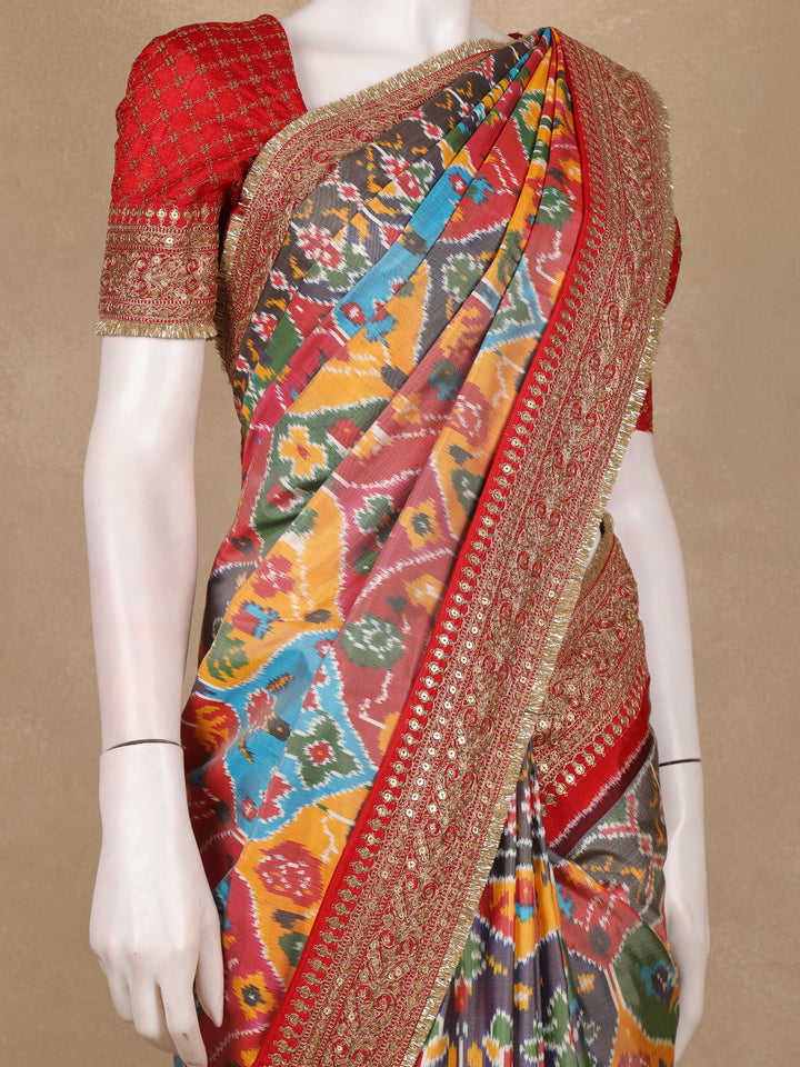 Celebrate artistry and elegance with this striking Multicolor Banarasi Silk Saree, a vibrant drape that exudes festive charm. Designed with a captivating ikat-inspired print, this saree brings together tradition and modern aesthetics seamlessly. The colorful patterns on the luxurious Banarasi silk base create a bold and lively statement, perfect for standing out at grand occasions.