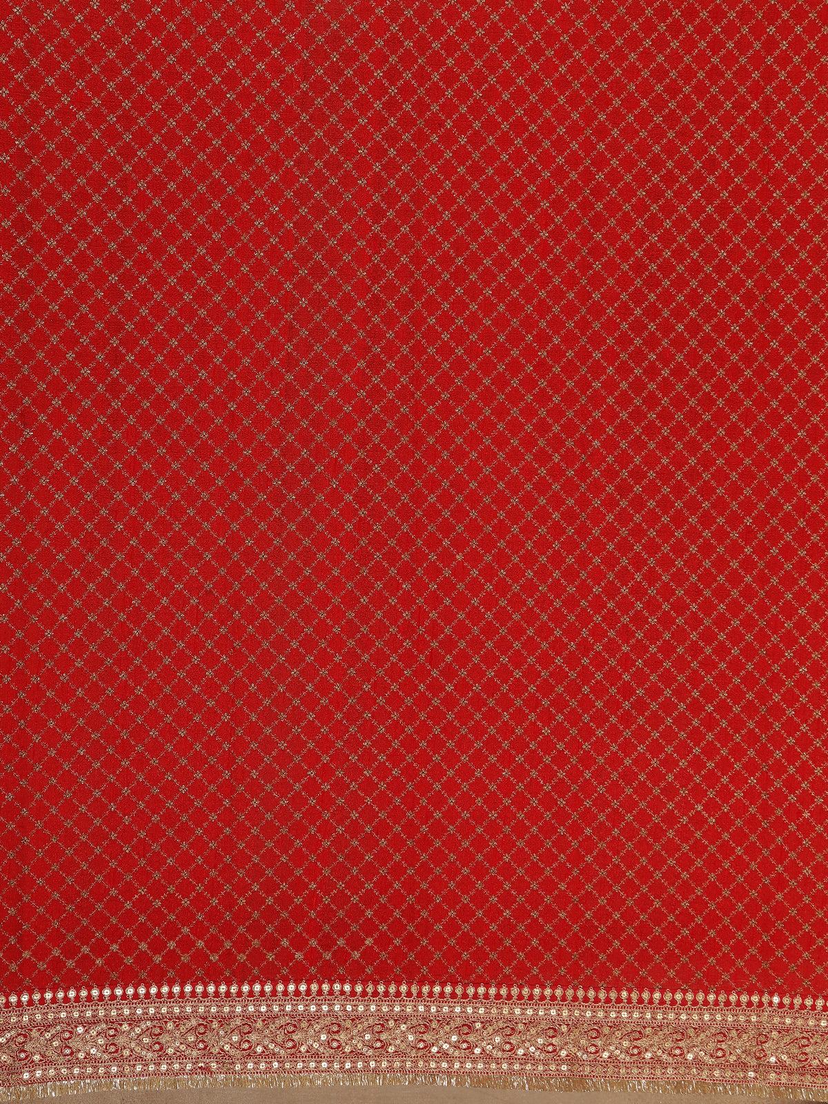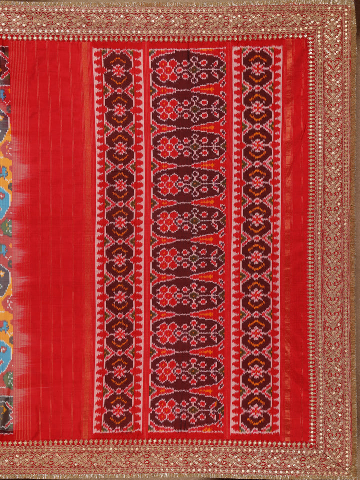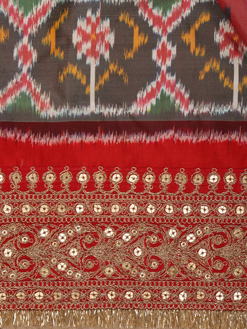 The saree is framed with a rich zari border and complemented by a contrasting red pallu and blouse, adding depth and richness to the overall look. Its smooth silk texture ensures a graceful fall and timeless appeal, making it ideal for party wear, festive celebrations, and special gatherings.
