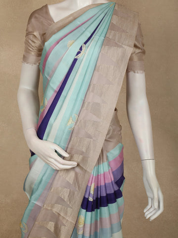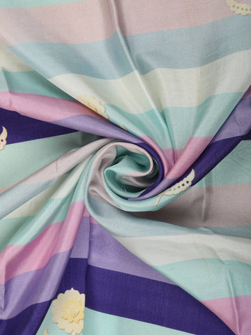 This elegant Pure Crepe Silk Saree is designed in a refreshing multicolor palette, featuring graceful horizontal striped woven patterns that create a soft, flowing visual appeal. Shades of aqua blue, pastel pink, muted lavender, and deep navy come together harmoniously, giving the saree a contemporary yet refined character. The smooth crepe silk texture lends a fluid drape and subtle sheen, making it exceptionally comfortable and graceful to wear.