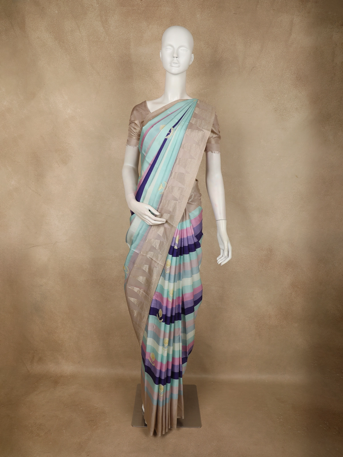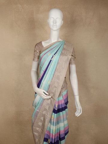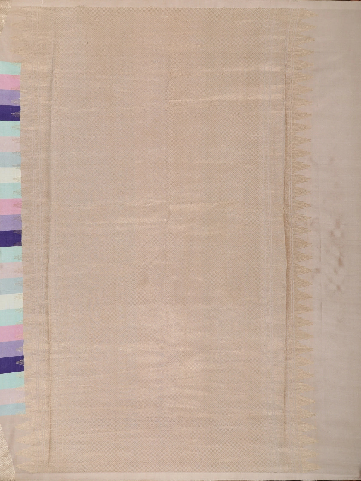 Adding a touch of tradition, the saree is highlighted with a contrast temple border in a warm soft beige-gold tone, intricately woven with classic temple motifs. The structured border beautifully frames the vibrant striped body, balancing modern colour play with heritage-inspired detailing. Delicate woven motifs scattered across the body further enhance its charm without overpowering the design. The pallu continues the striped elegance, finished with refined zari accents for a polished look.
