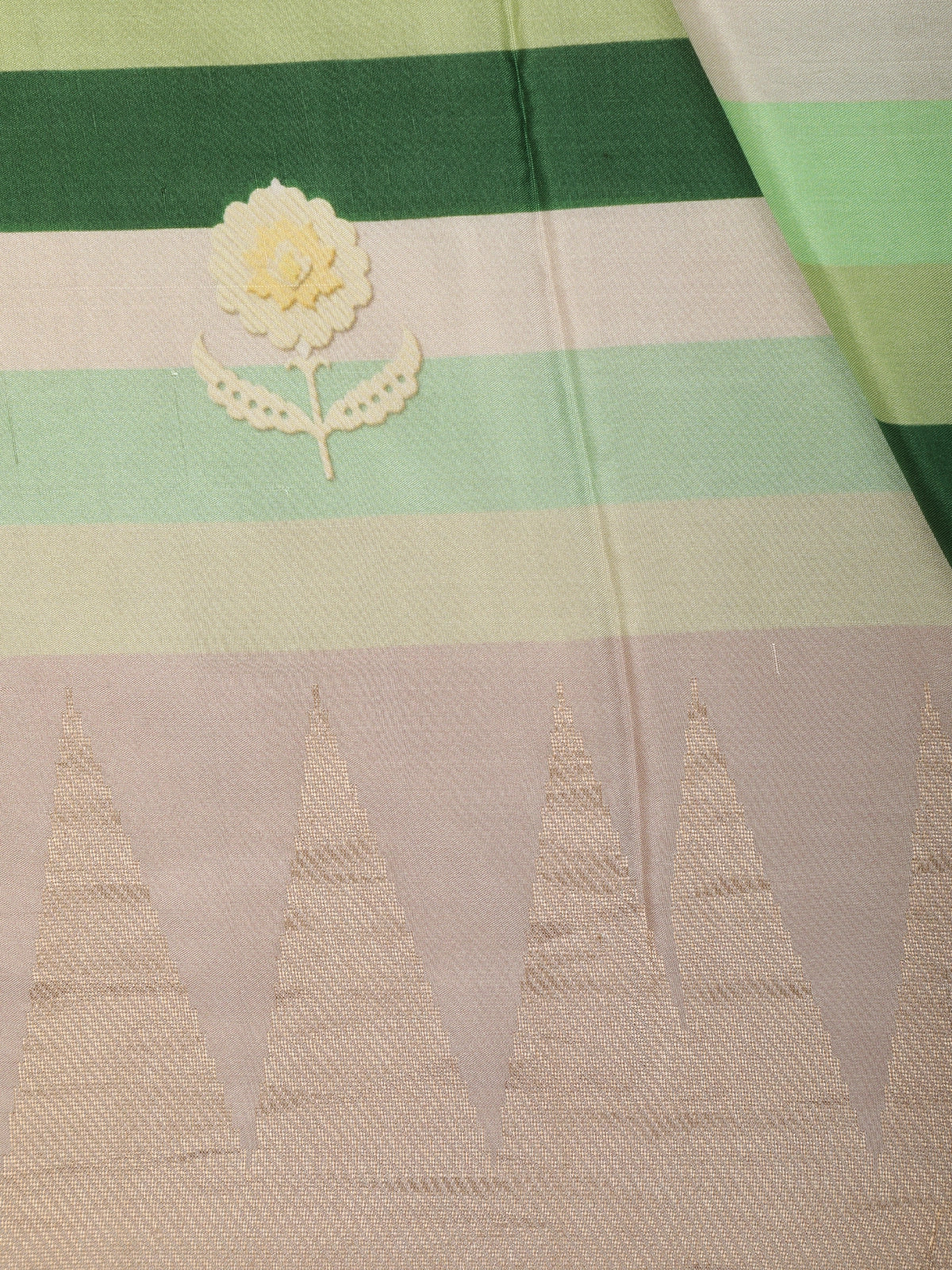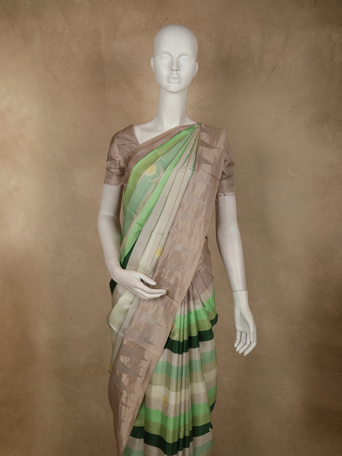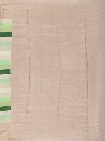 Adding a touch of traditional charm, the saree is highlighted with a contrast temple border in a warm soft taupe–beige tone, intricately woven with classic temple-inspired motifs. The structured border lends a heritage feel and perfectly frames the modern striped body. Subtle woven buttas scattered across the saree enhance its elegance without overwhelming the clean design. The pallu continues the striped theme, finished with delicate zari accents for a polished look.