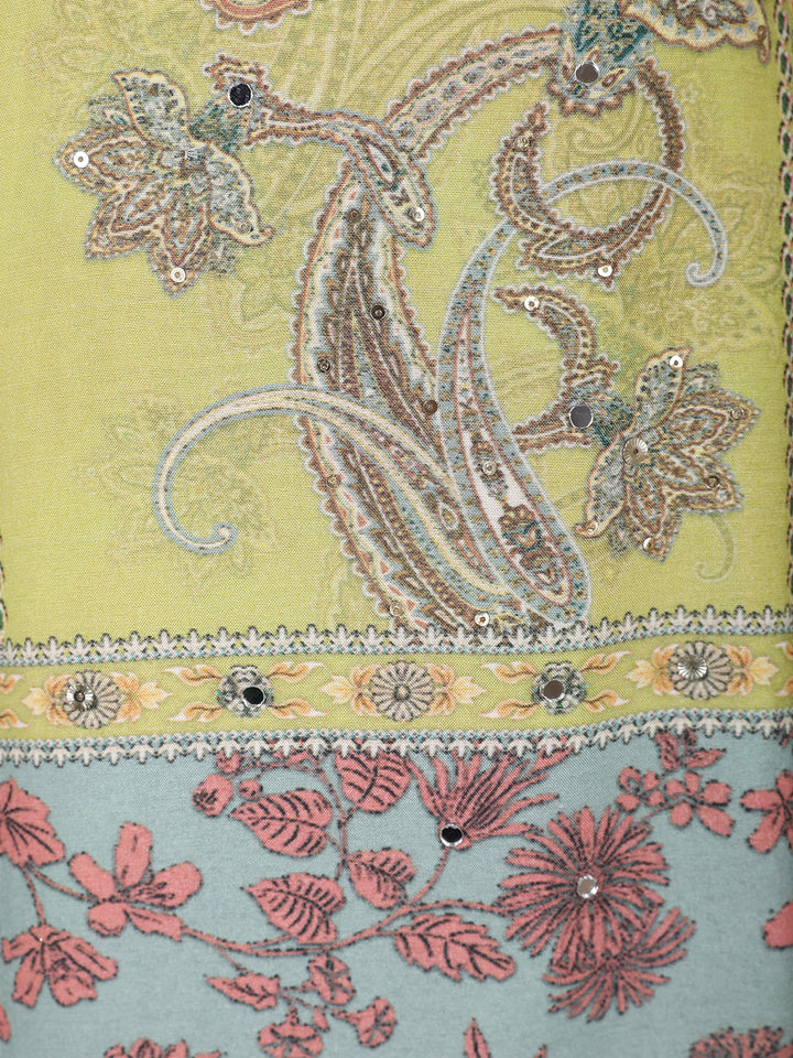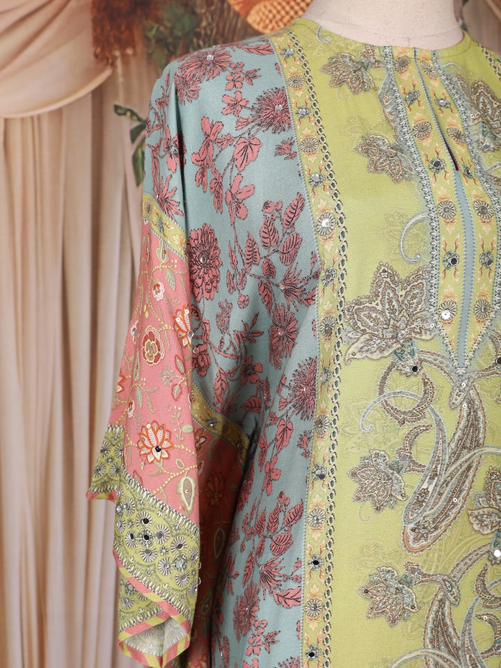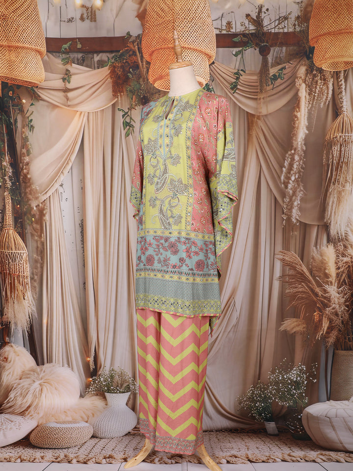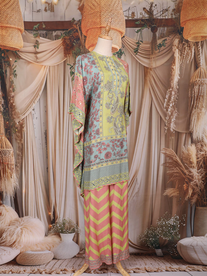 Step into a world of pastel elegance with this charming kaftan-style palazzo suit. Crafted in soothing tones of lime green, peach, and muted teal, the kurta showcases an intricate mix of floral and paisley prints highlighted with subtle thread and sequin embroidery. The wide kaftan sleeves lend a relaxed yet graceful silhouette, perfect for breezy comfort. Paired with a peach and yellow chevron-patterned palazzo, the ensemble strikes the perfect harmony between ethnic charm and modern flair — ideal for festive brunches, casual celebrations, and resort gatherings.