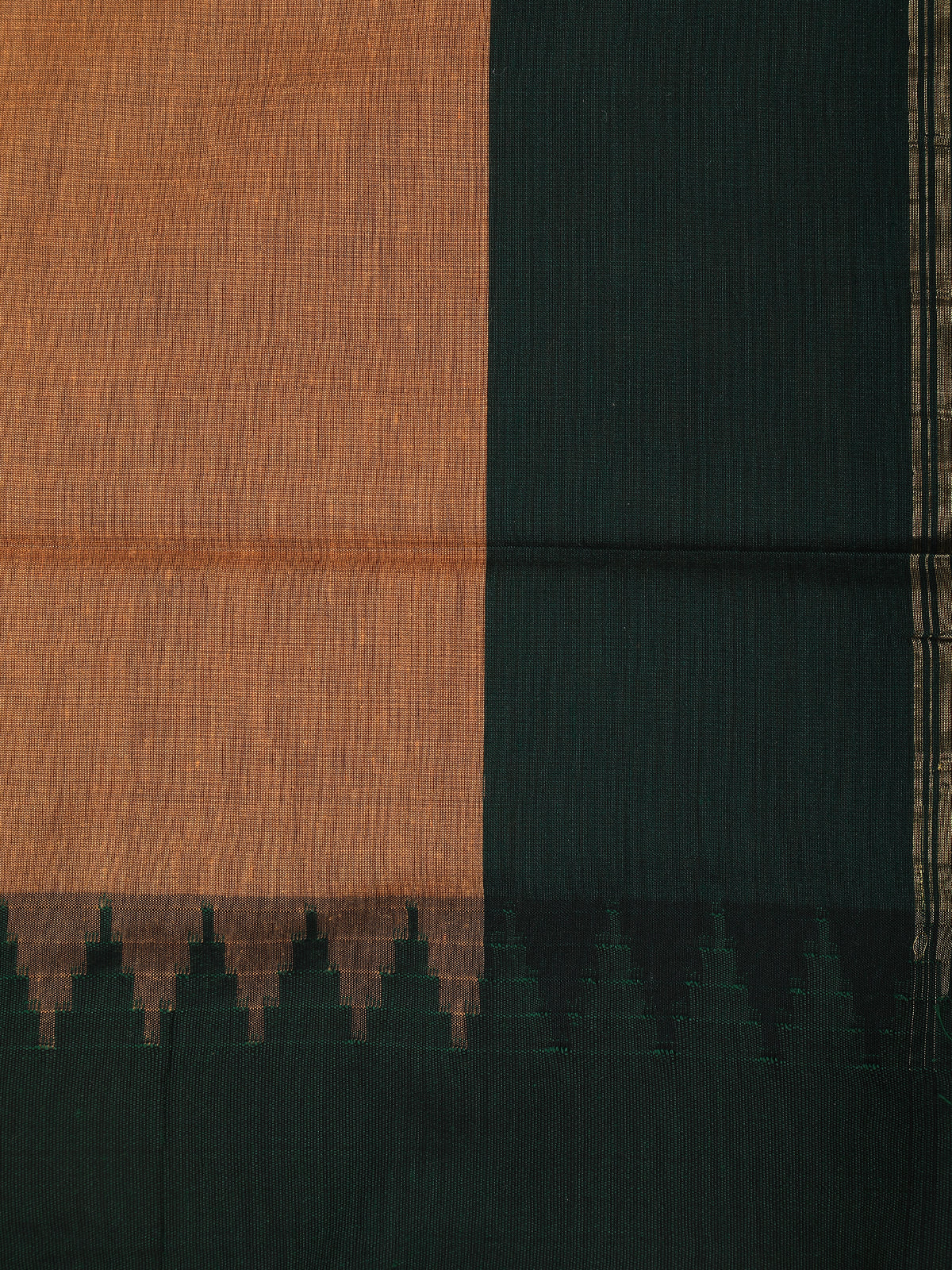 Crafted from premium Kalyani cotton, this saree offers a breathable, lightweight texture with a gentle natural sheen, ensuring all-day comfort. The saree features a solid body that beautifully highlights the richness of the fabric, while the contrast royal black temple border adds a striking traditional touch. Accented with a fine gold line, the temple-inspired border enhances the saree’s ethnic appeal without overwhelming its minimalist design.