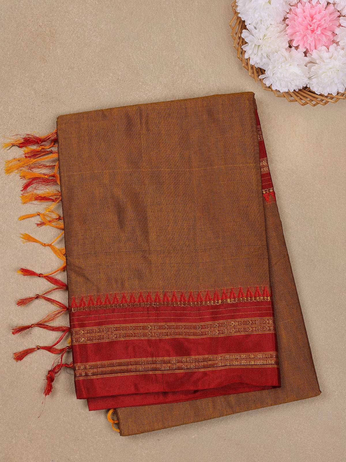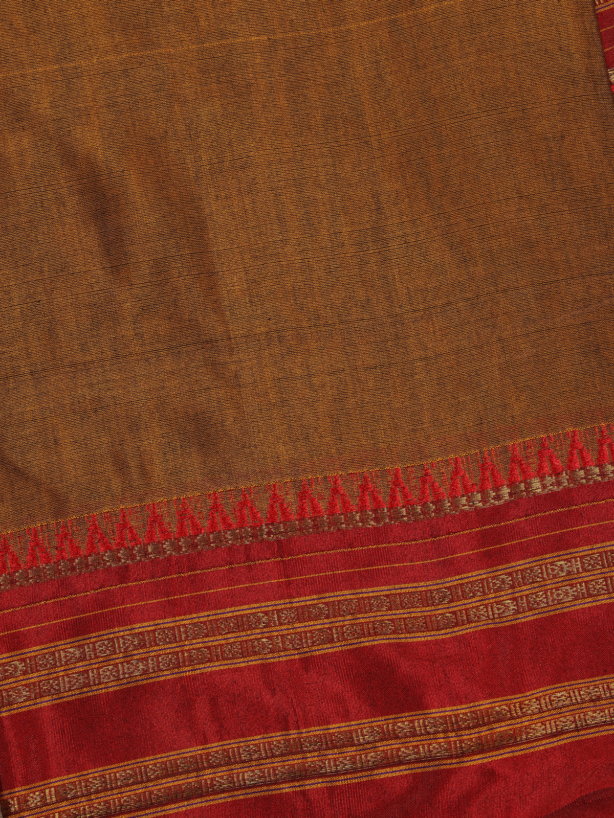 Elegant and rooted in tradition, this saree beautifully brings together earthy hues and subtle sophistication. The body features a warm mustard-brown shade with a finely woven handloom texture that adds depth and character. The highlight is the classic contrast red border, adorned with delicate zari woven temple motifs and fine geometric lines, lending a graceful festive charm.