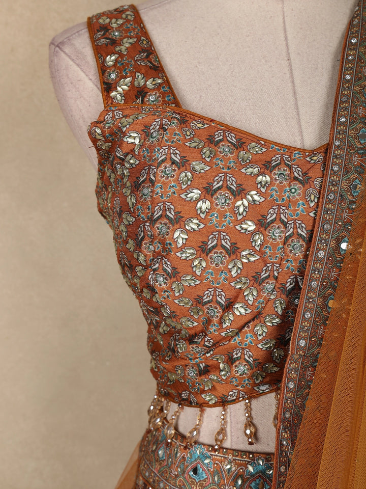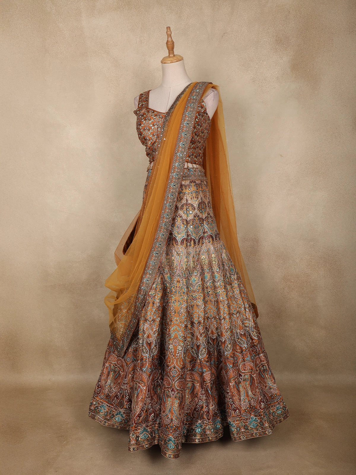 Drape yourself in royal elegance with this exquisite mustard silk lehenga set, intricately adorned with floral and paisley embroidery. The flared lehenga brings a graceful volume, while the sleeveless blouse featuring a sweetheart neckline adds a modern touch. Paired with a soft net dupatta embellished with a finely detailed border, this ensemble showcases the perfect balance of tradition and glamour. Ideal for weddings, sangeet nights, receptions, and grand festive celebrations. A timeless masterpiece designed to make every moment unforgettable.