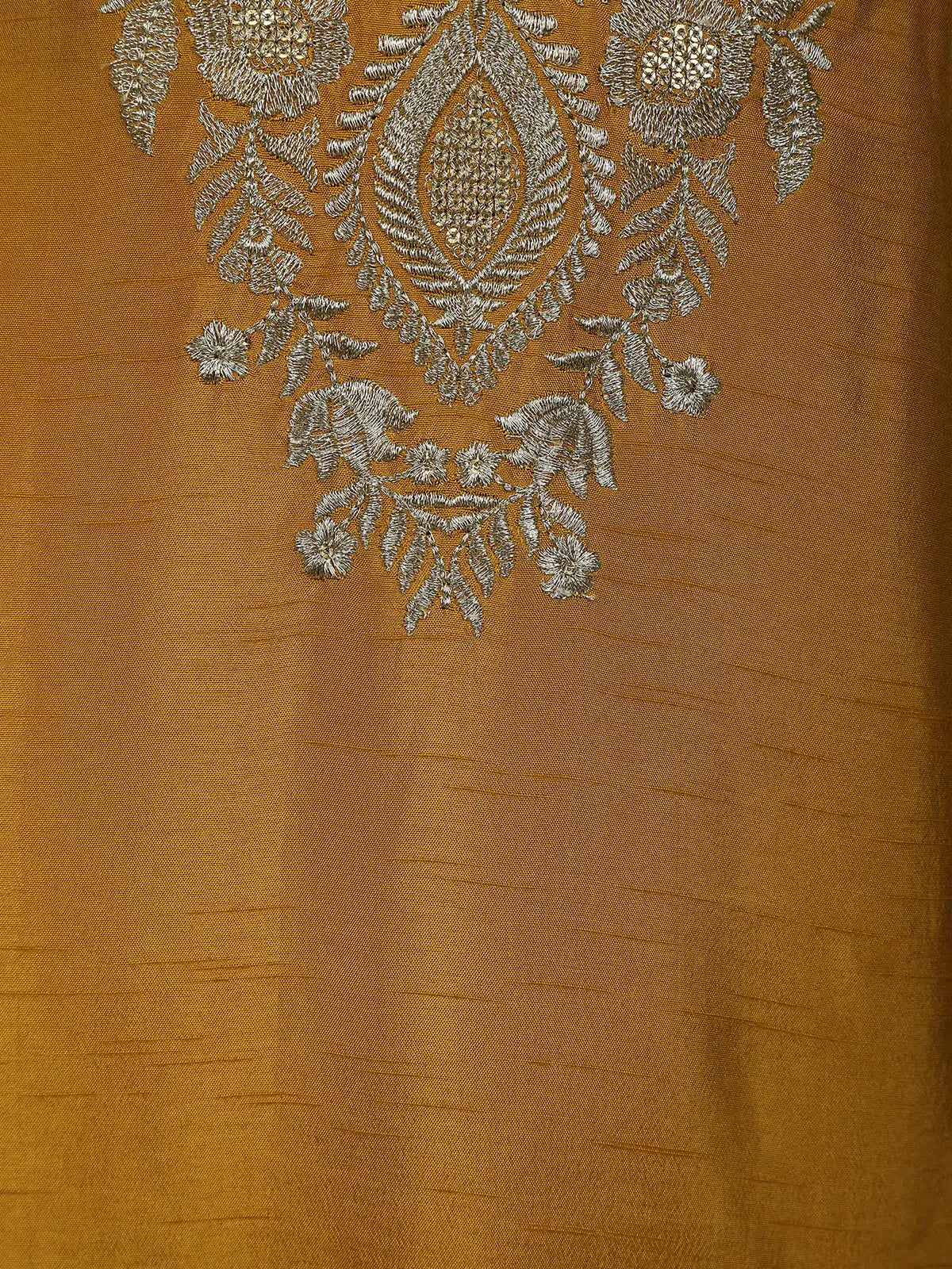 Radiate festive charm with this Mustard Floral Designed Semi Silk Salwar Suit, thoughtfully designed for special occasions and elegant daywear. Crafted from high-quality semi silk fabric, the straight-cut kurta showcases intricate floral embroidery work that adds richness and texture to the vibrant mustard base.