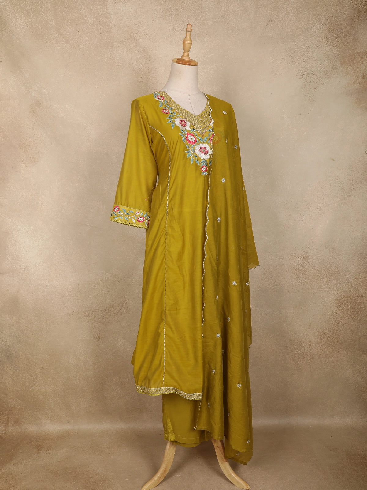 Mustard Floral Embroidered Tissue Silk Straight Cut Salwar Suit with Dupatta
