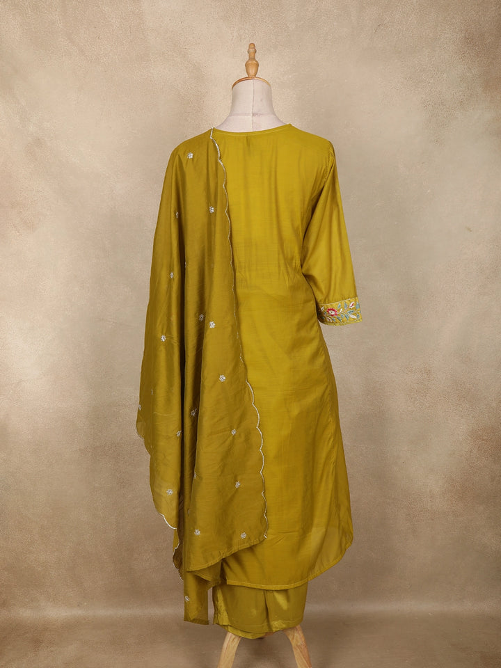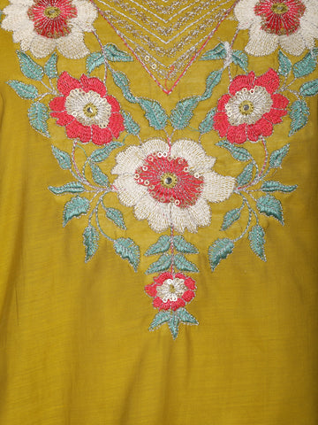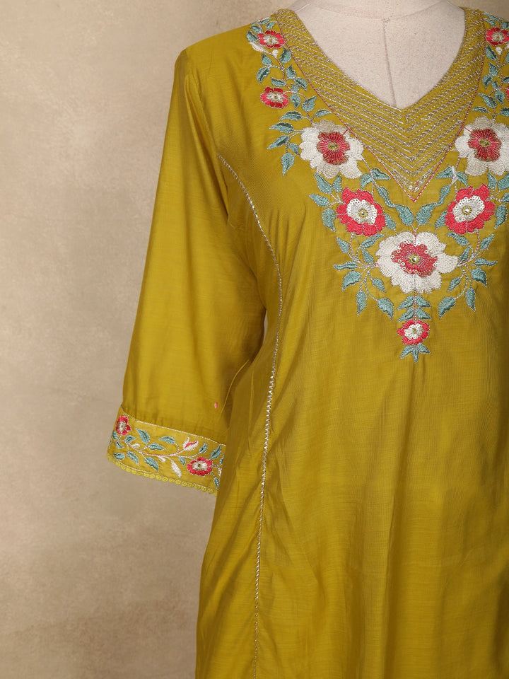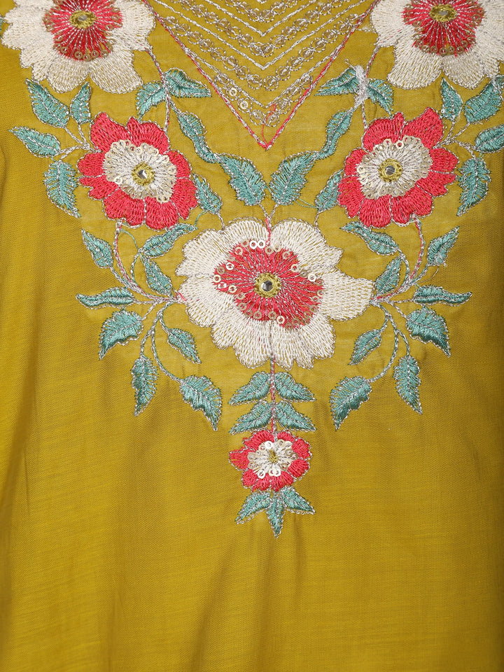 Elevate your festive and everyday elegance with this mustard tissue silk straight-cut salwar suit, beautifully crafted with vibrant floral embroidery. The kurta features a graceful V-neckline highlighted with multicolour threadwork and delicate scallop detailing, adding a feminine charm. Floral motifs adorn the neckline and sleeve cuffs, bringing a refreshing burst of colour against the rich mustard base.