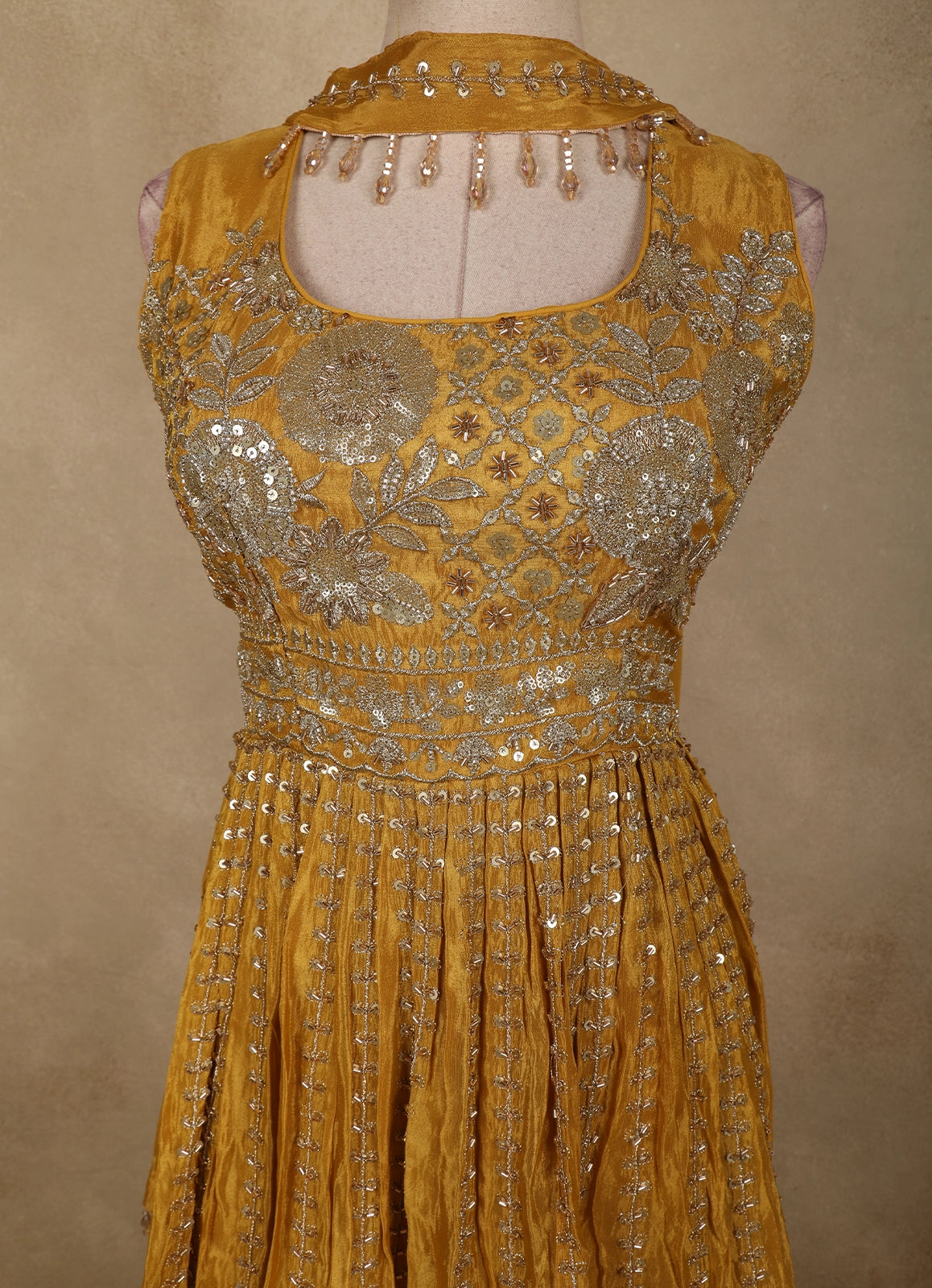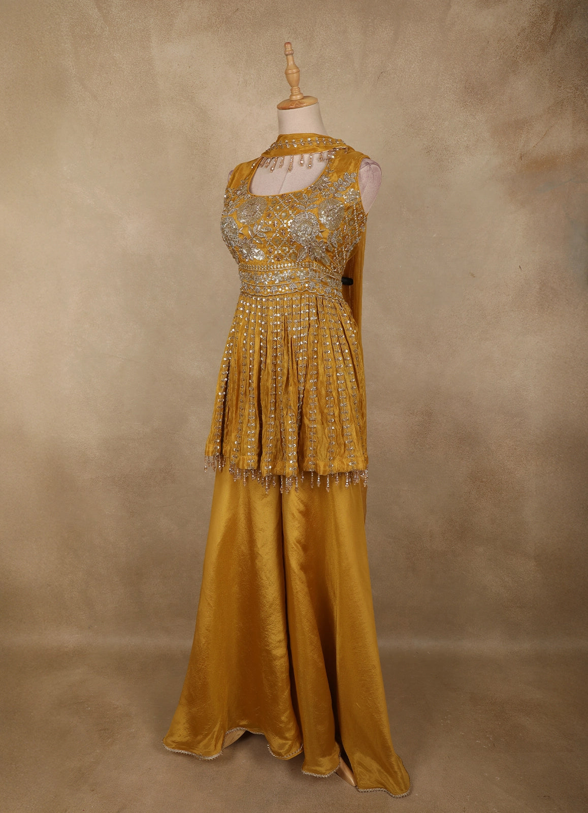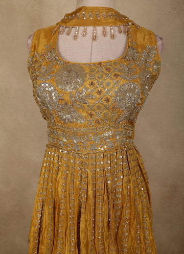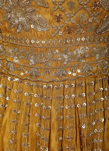 Radiate festive elegance in this Mustard Gold Floral Sequins and Beads Embroidered Design Tissue Peplum Palazzo Suit with Dupatta, crafted to make a striking statement at celebrations. The peplum top is beautifully adorned with intricate floral embroidery highlighted by shimmering sequins and delicate beadwork, creating a rich, textured appeal. The tissue fabric lends a subtle sheen, enhancing the regal mustard gold tone.