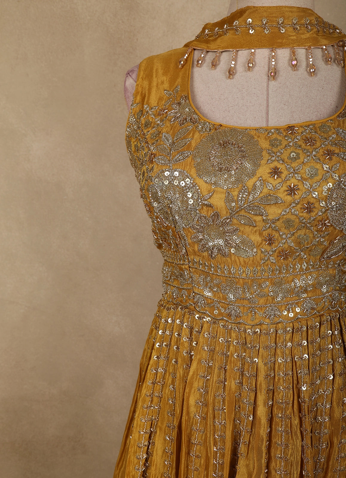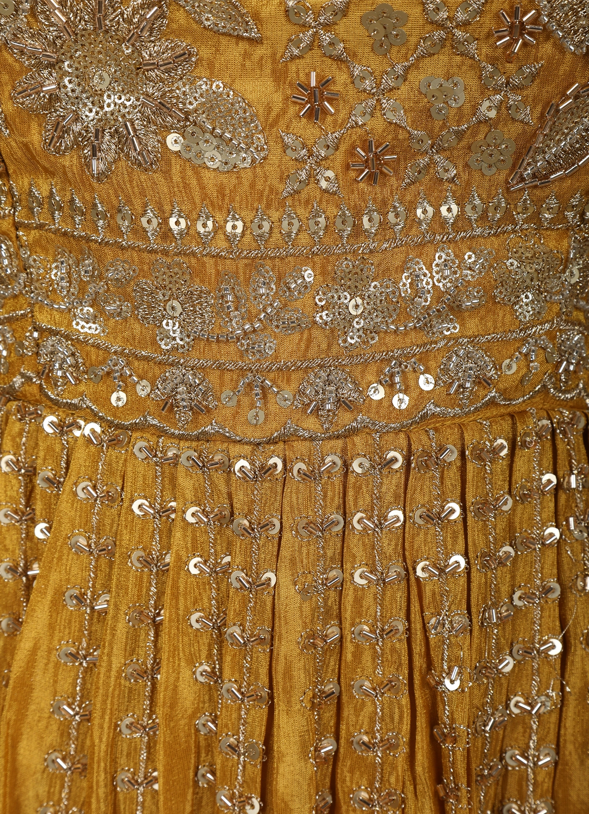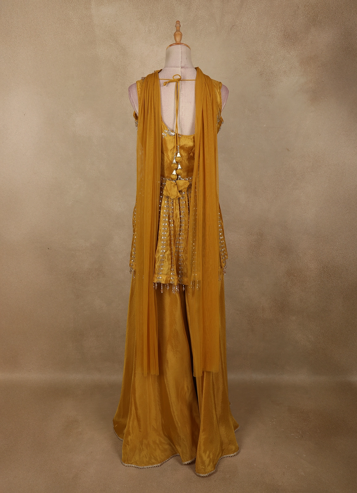 Radiate festive elegance in this Mustard Gold Floral Sequins and Beads Embroidered Design Tissue Peplum Palazzo Suit with Dupatta, crafted to make a striking statement at celebrations. The peplum top is beautifully adorned with intricate floral embroidery highlighted by shimmering sequins and delicate beadwork, creating a rich, textured appeal. The tissue fabric lends a subtle sheen, enhancing the regal mustard gold tone.