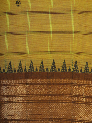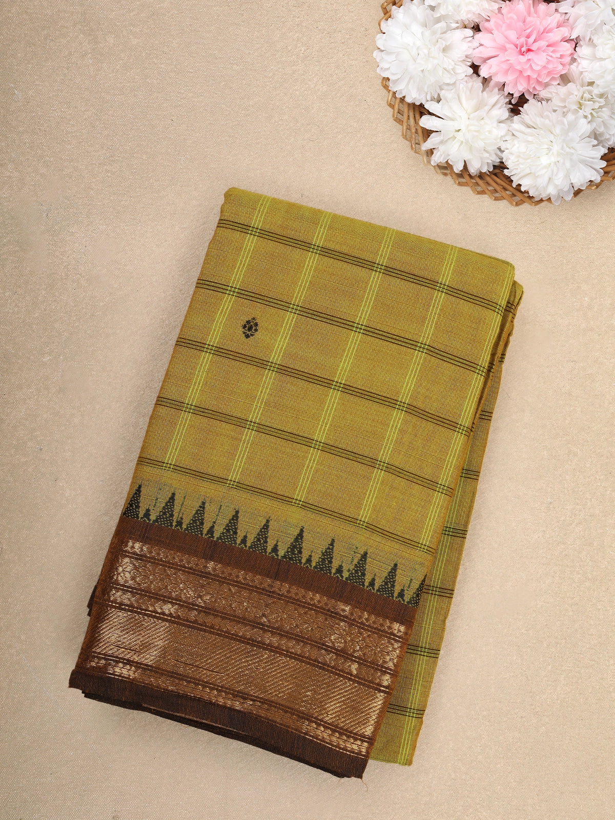 Mustard Green Checks Design Cotton Saree with Brown Zari Woven Border