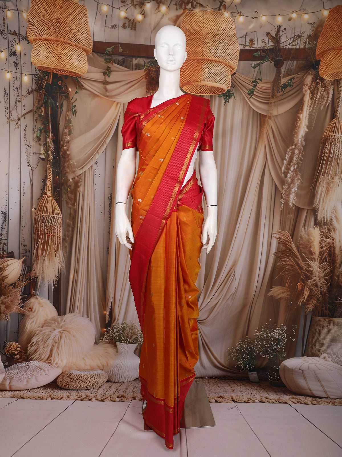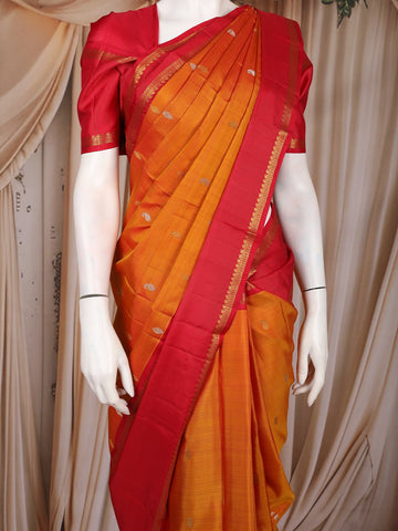 Its contrast red zari-woven border and pallu add a striking dimension, beautifully enhancing the vibrant mustard tone. The smooth, glossy texture of pure silk ensures a luxurious drape that falls elegantly, making it a perfect choice for weddings, festive occasions, and cultural celebrations.