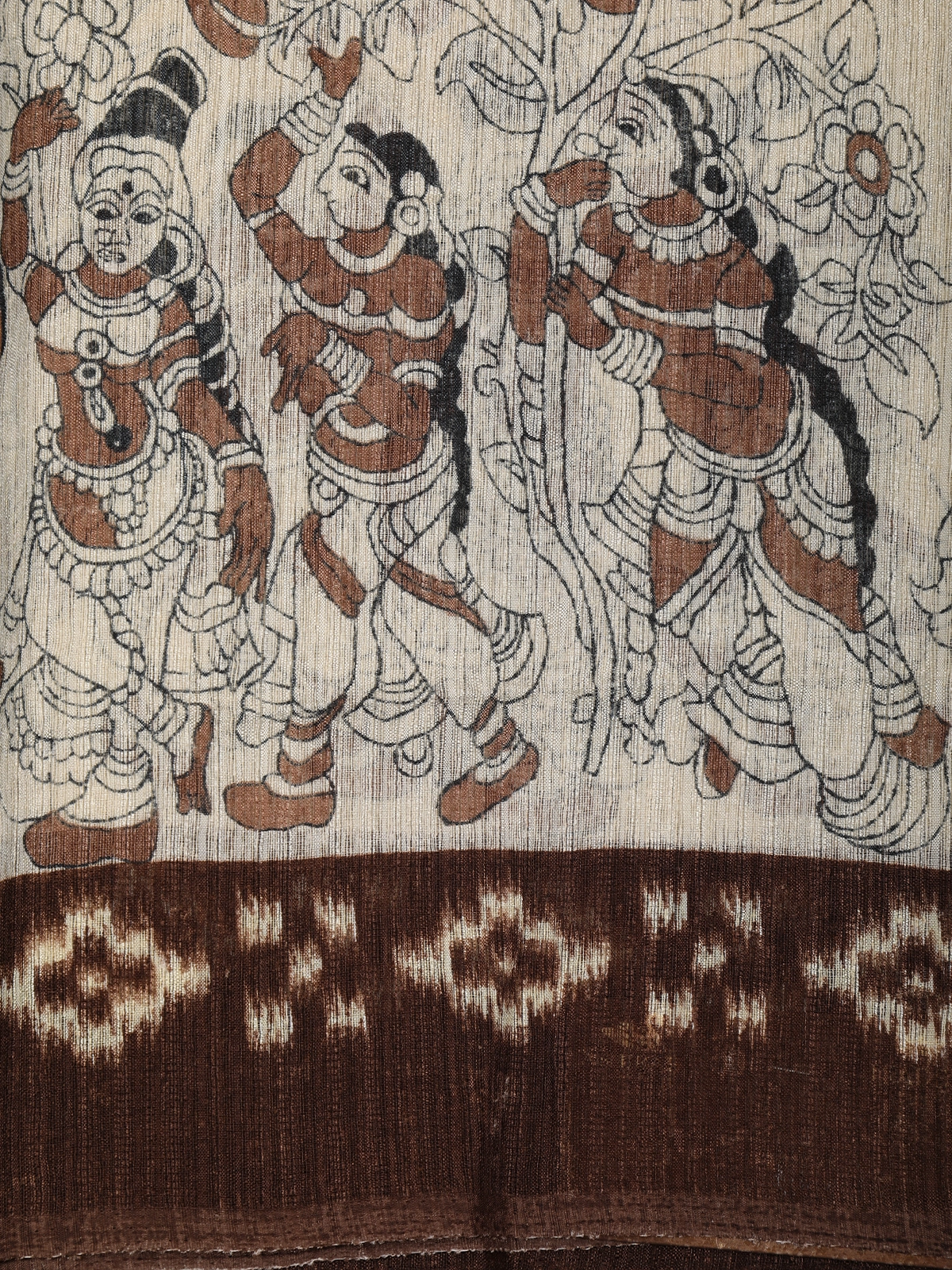 Enhancing its appeal is the striking Kalamkari-style border, adorned with detailed figurative motifs inspired by classical dancers and floral vines. Rendered in warm brown and ivory tones, the border adds a rich narrative element, making the saree visually captivating and culturally rooted. The gentle color gradation from ivory to mustard orange further elevates the handcrafted charm of the design.