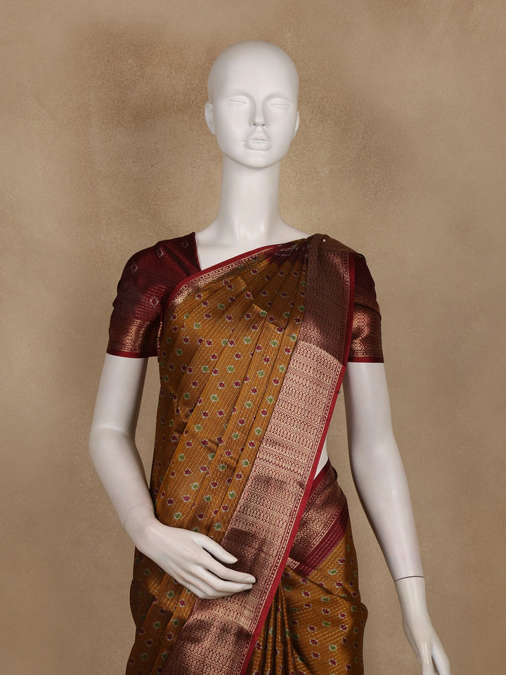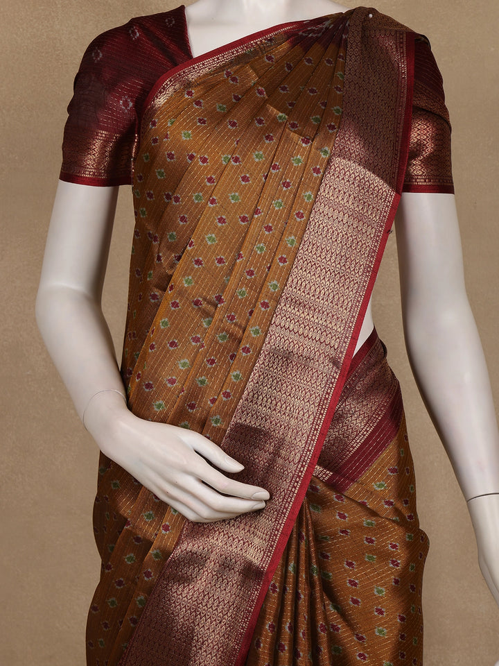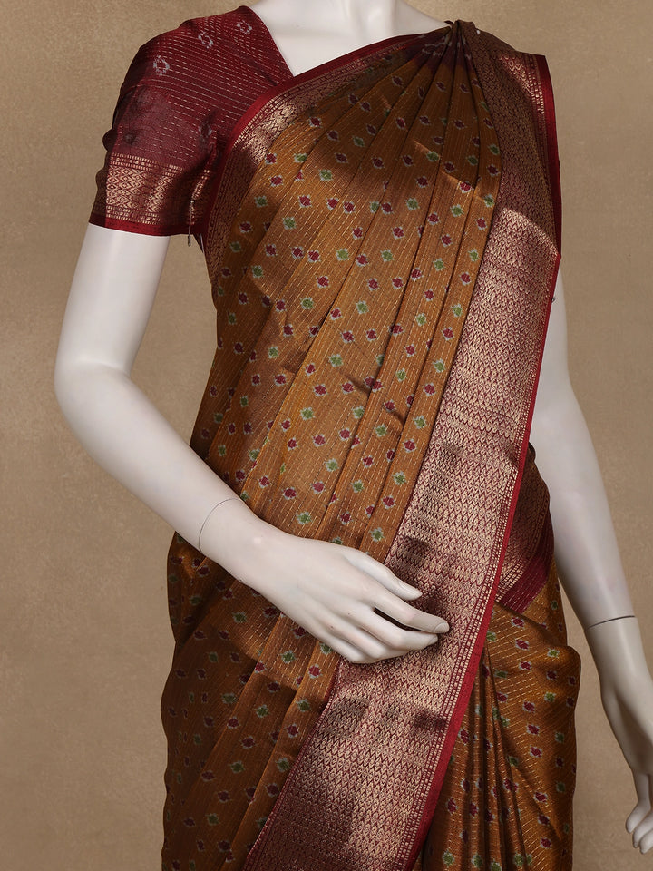 Immerse yourself in the charm of traditional craftsmanship with this Mustard Pochampally Ikat Design Cotton Saree. The saree features intricate geometric Ikat patterns woven into a rich mustard base, highlighted with a lustrous zari border that adds an elegant festive touch. The contrast maroon pallu and blouse complement the saree beautifully, offering a perfect blend of vibrancy and grace. Crafted from breathable cotton, this saree ensures all-day comfort while keeping your style effortlessly classic.