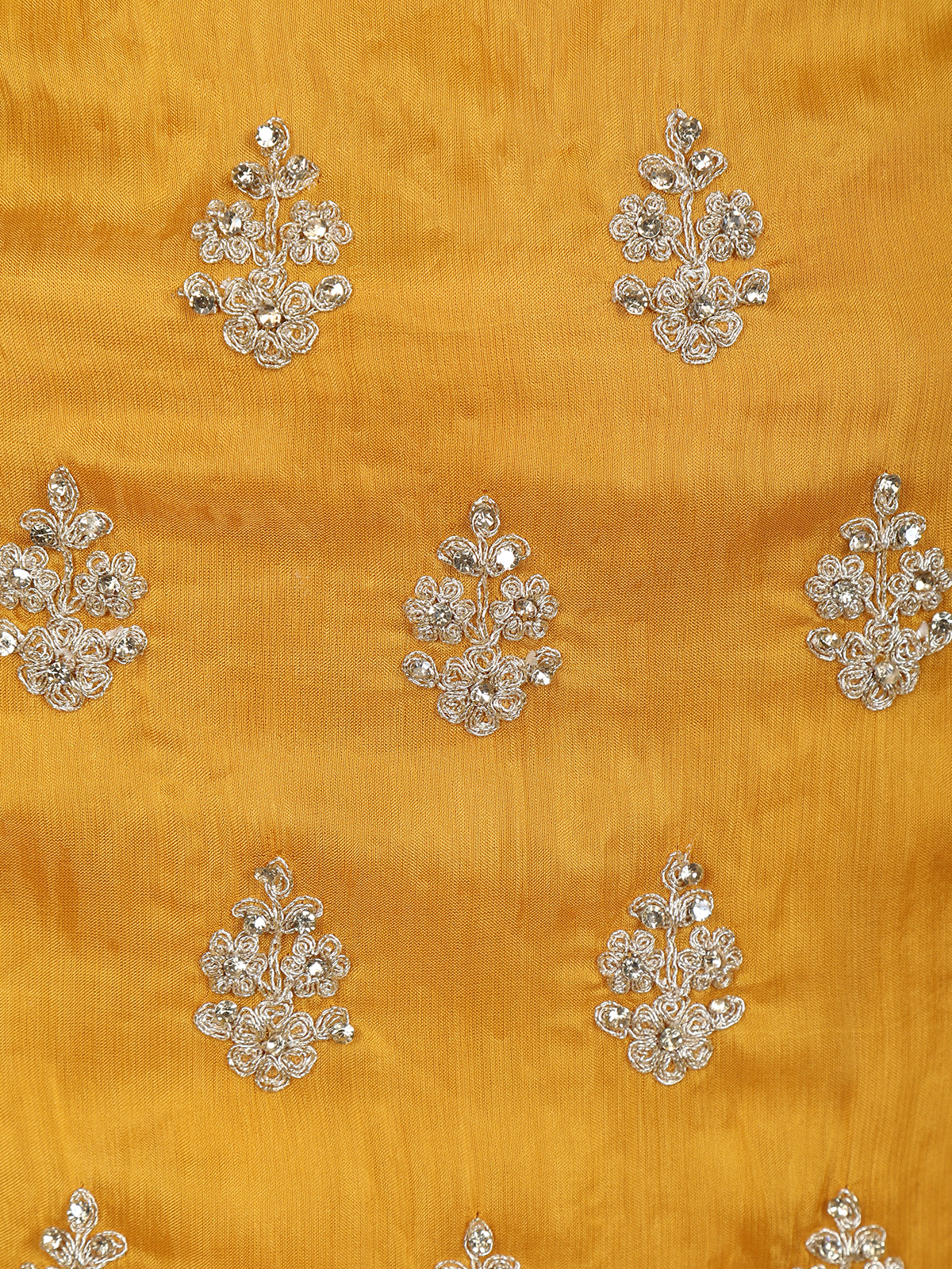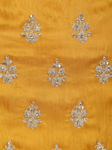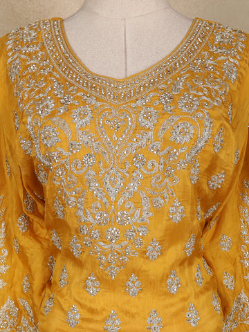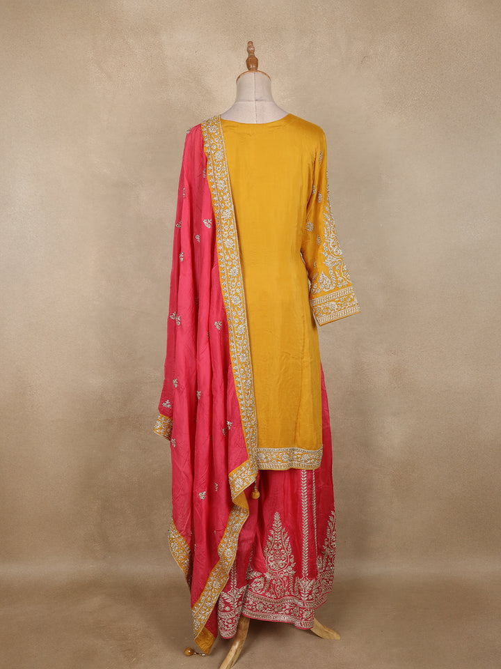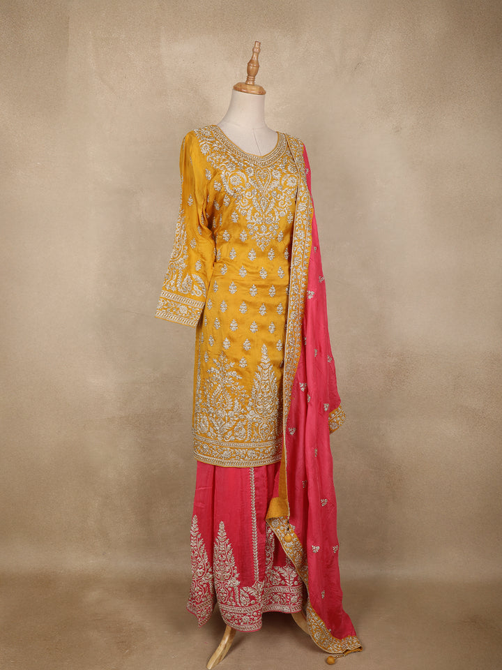 Mustard Yellow and Pink Heavy Embroidered Design Silk Palazzo Suit