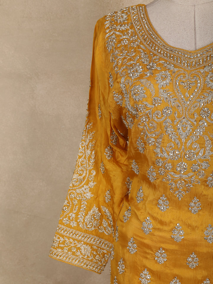 Celebrate tradition with a vibrant touch in this stunning Mustard Yellow and Pink Heavy Embroidered Silk Palazzo Suit — a perfect choice for festive moments and graceful occasions. The mustard yellow kurta is adorned with exquisite thread embroidery, zari highlights, and shimmering sequin patterns that showcase detailed craftsmanship and a majestic ethnic appeal.