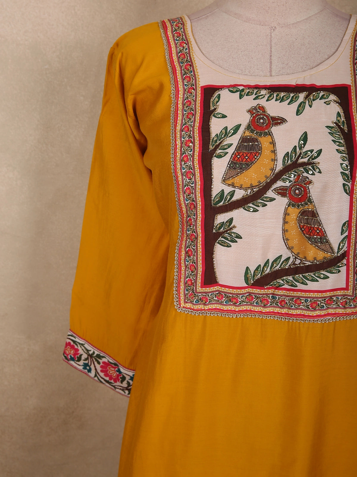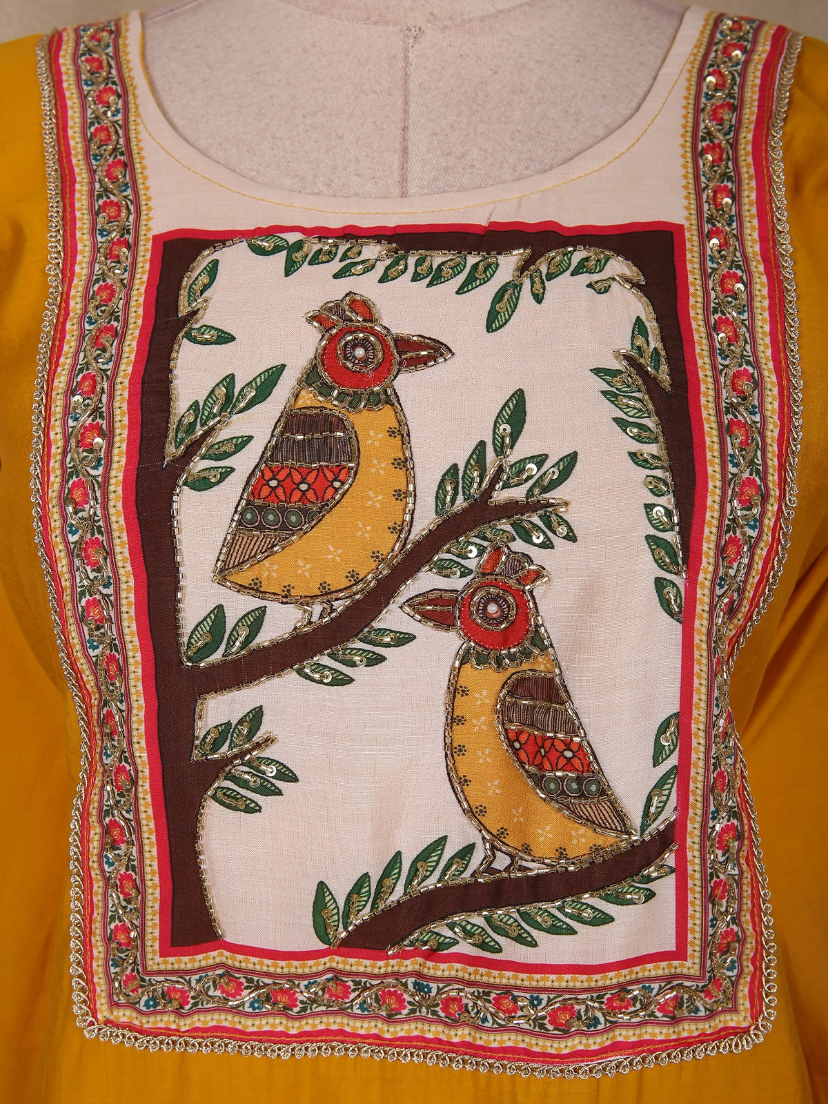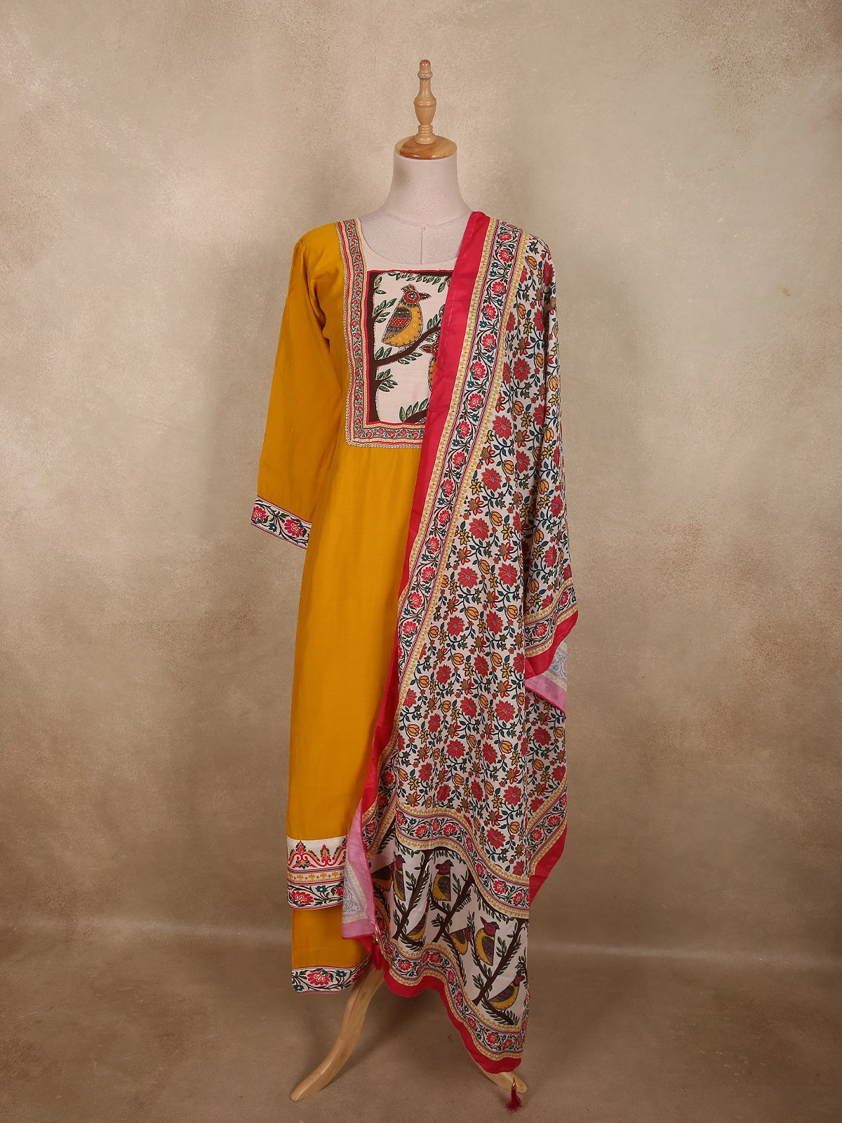 Radiating warmth and earthy elegance, this Mustard Yellow Cotton Palazzo Suit beautifully blends traditional artistry with everyday comfort. Designed in a rich mustard hue, the kurta features a striking bird motif printed chest panel framed with intricate floral borders, adding a handcrafted, folk-inspired charm to the ensemble.