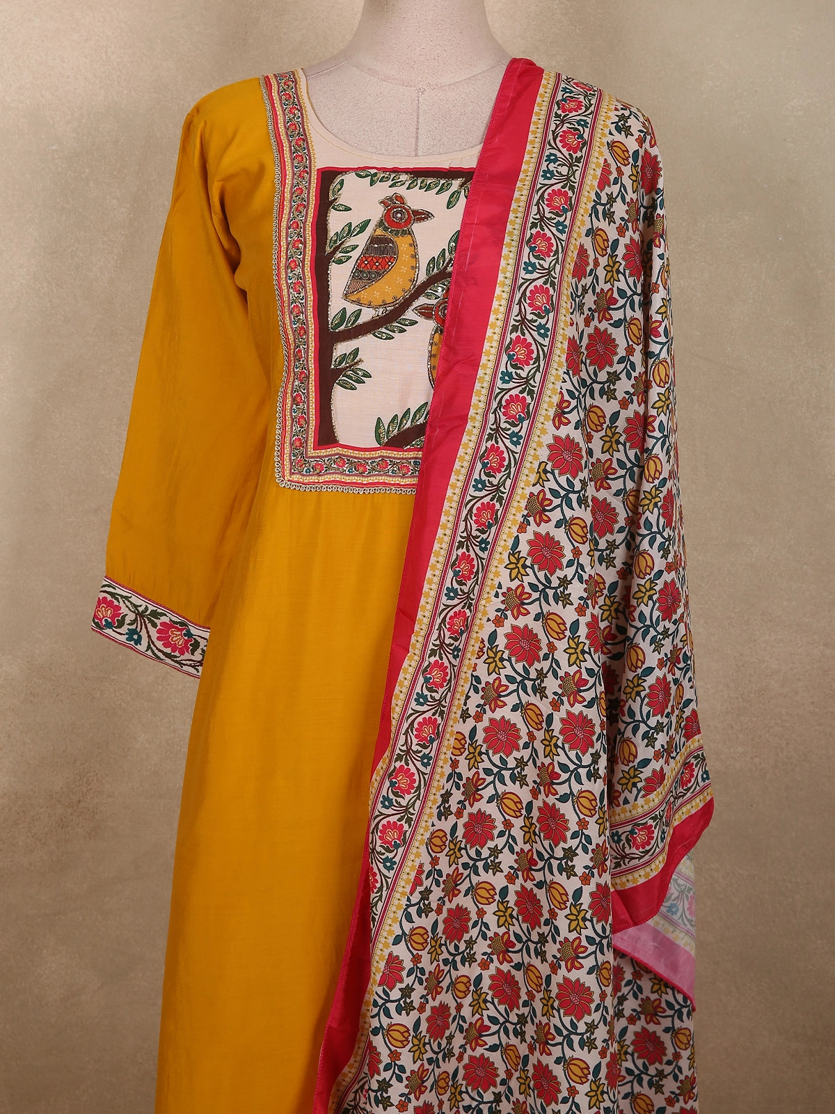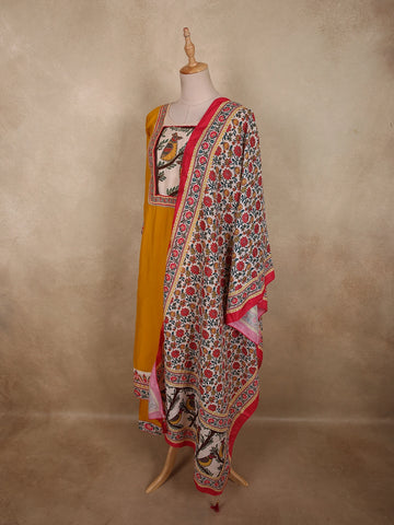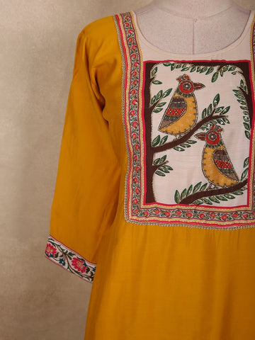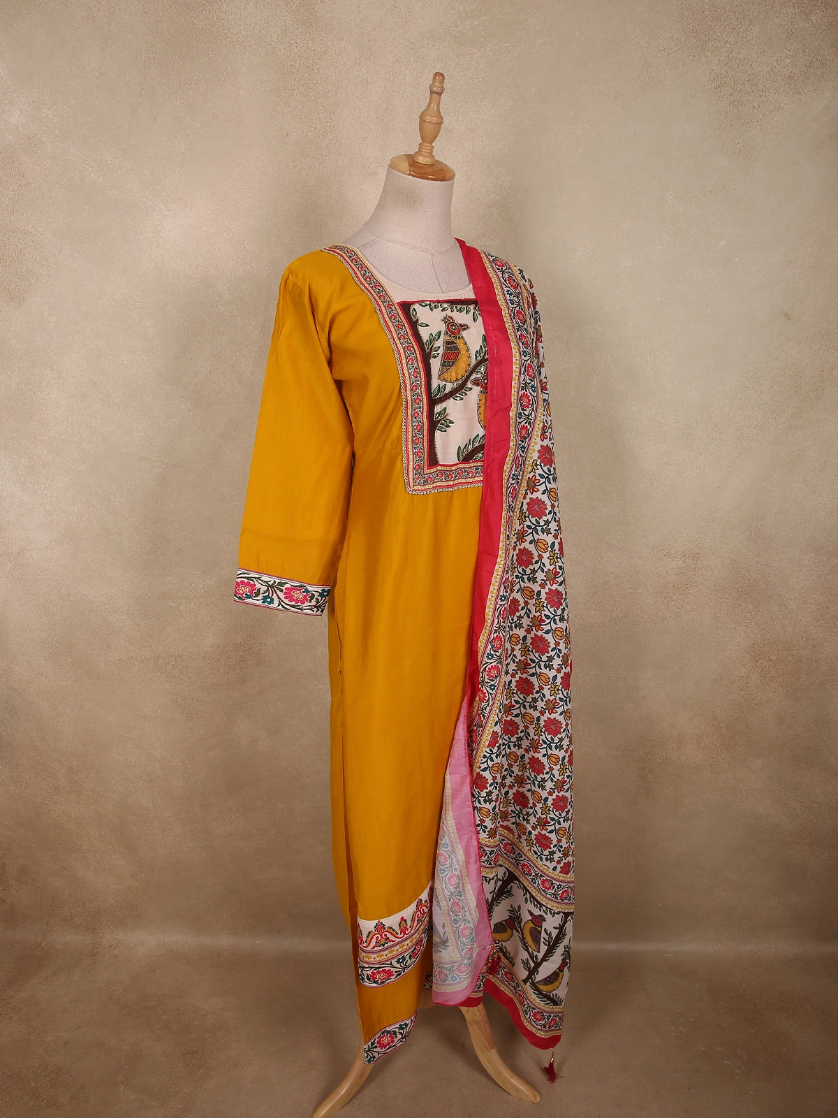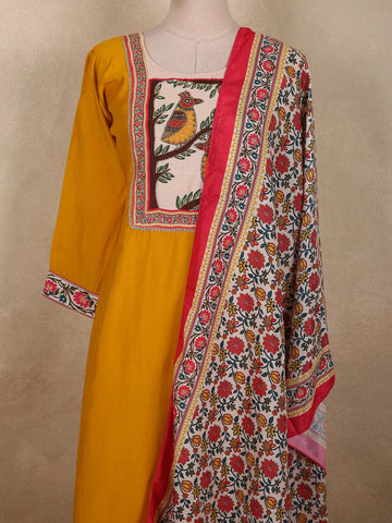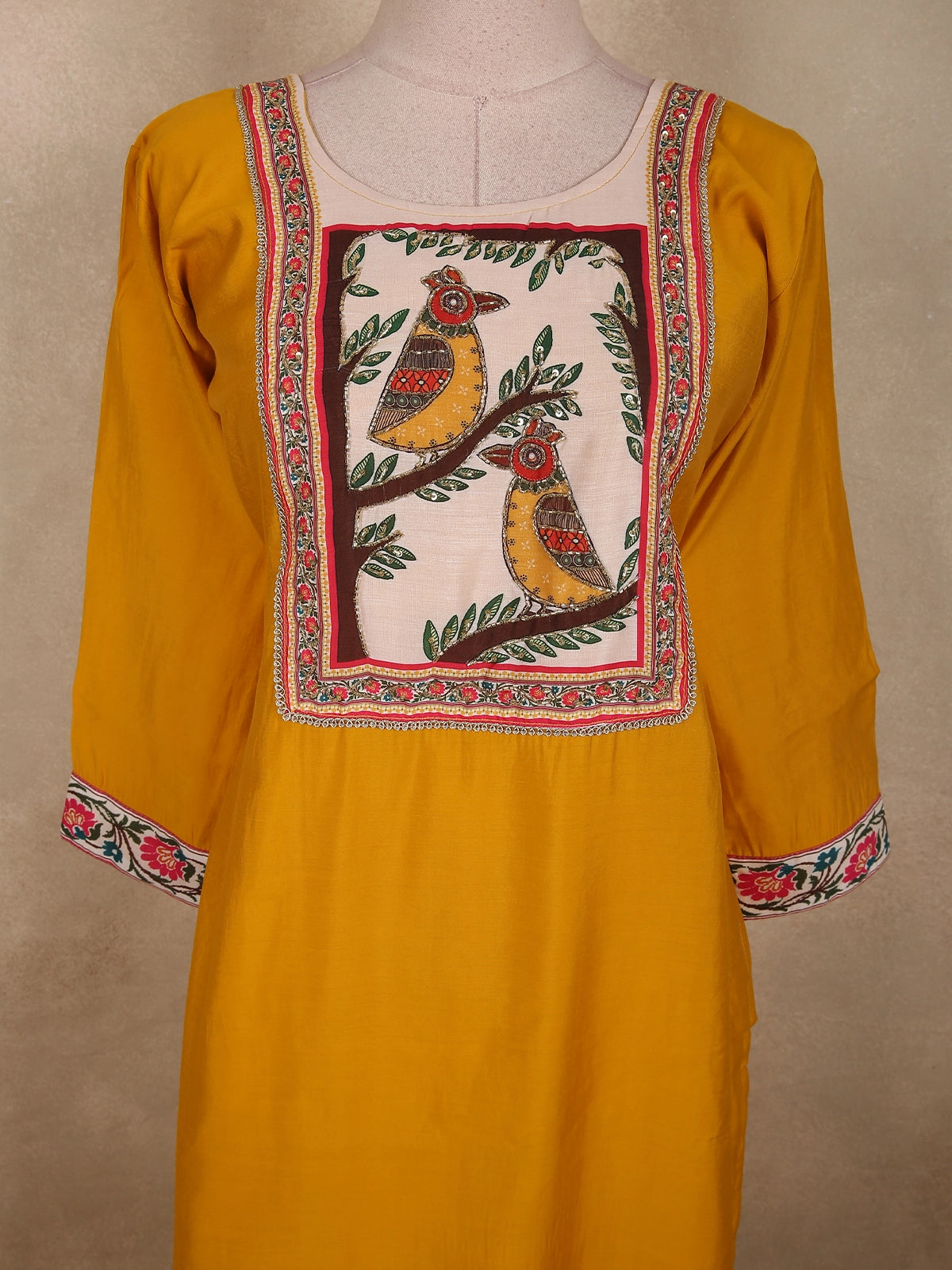 Radiating warmth and earthy elegance, this Mustard Yellow Cotton Palazzo Suit beautifully blends traditional artistry with everyday comfort. Designed in a rich mustard hue, the kurta features a striking bird motif printed chest panel framed with intricate floral borders, adding a handcrafted, folk-inspired charm to the ensemble.