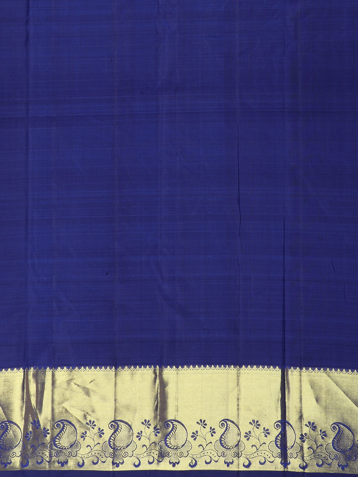 Enhancing the saree’s brilliance is a bold contrast paisley zari border in deep royal blue, intricately woven with antique gold zari detailing. The graceful paisley and floral patterns lend a regal finish, while the contrasting border beautifully frames the saree, creating a classic and eye-catching silhouette. The coordinated pallu continues the ornate zari work, completing the look with grandeur.