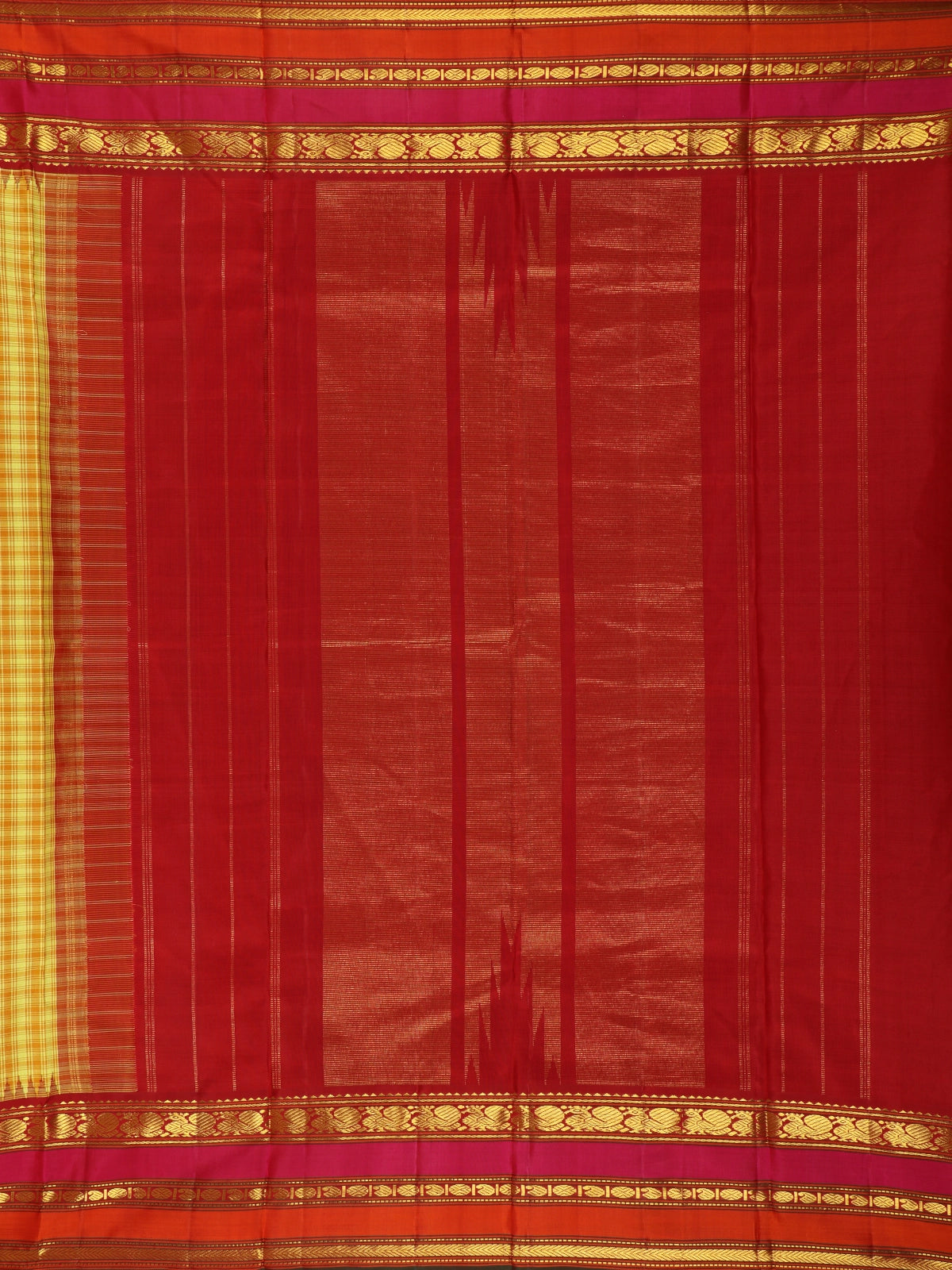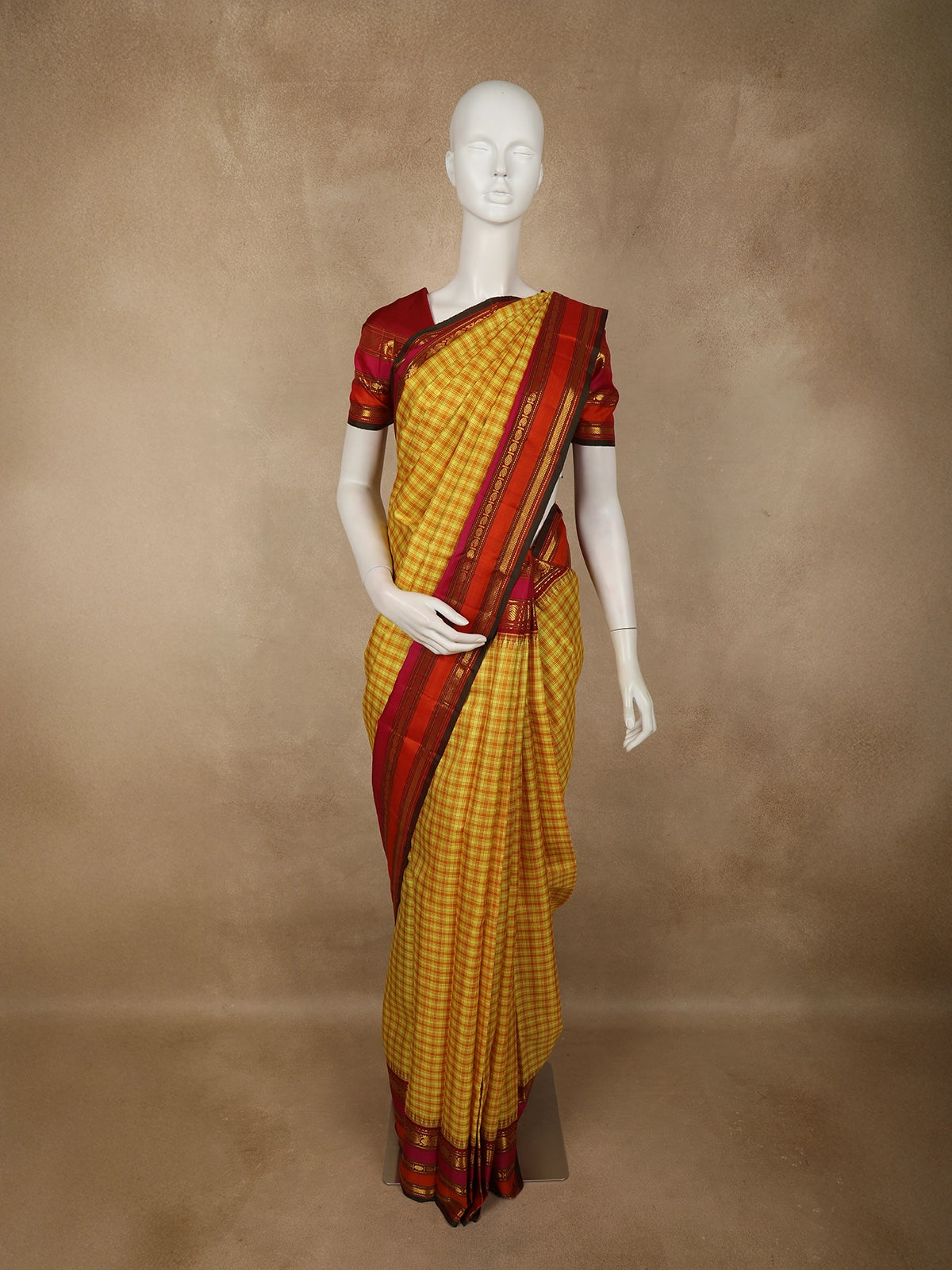 This classic Pure Kanchipuram Silk Saree is woven in a radiant mustard yellow hue, enhanced with a traditional checked woven design that brings depth and timeless charm to the silk body. The fine checks create a structured elegance while allowing the natural sheen of Kanchipuram silk to stand out beautifully.