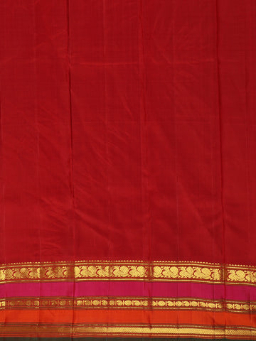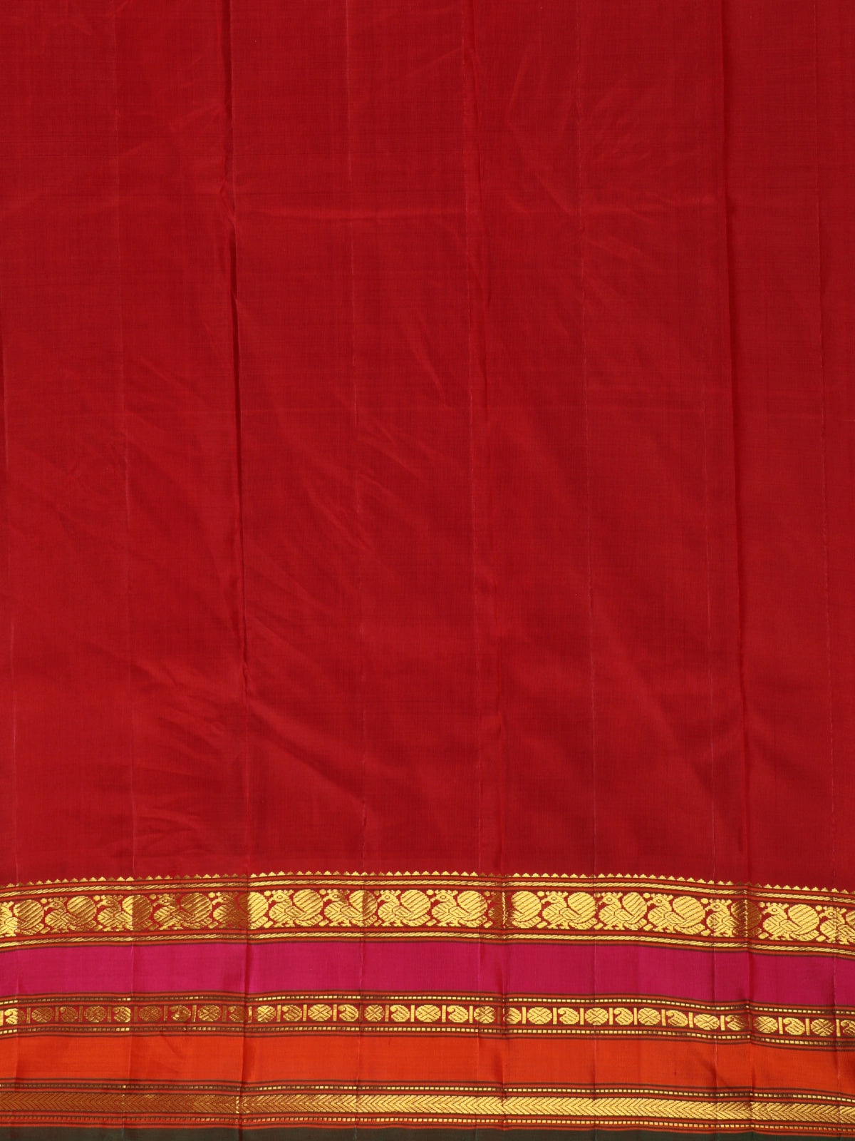 The saree is highlighted with a striking contrast border in deep red and burnt orange tones, intricately detailed with paisley zari motifs in rich antique gold. The ornamental paisley weaving adds a heritage-inspired touch, while the bold border frames the saree with regal sophistication. Subtle hints of rani pink accents further elevate the richness of the colour palette.