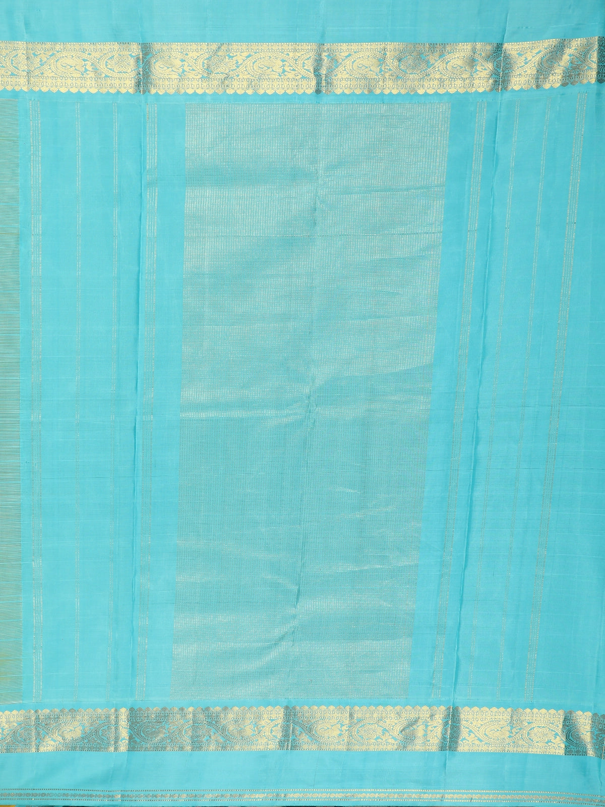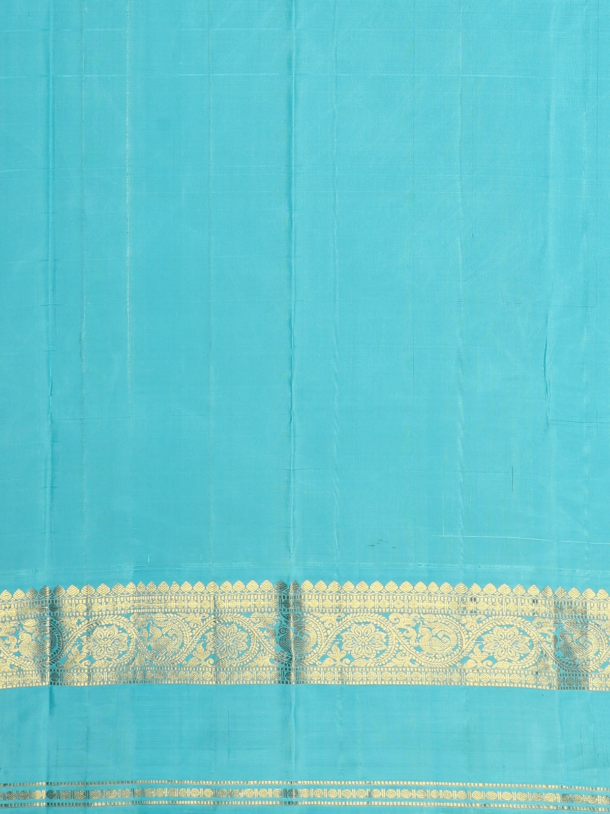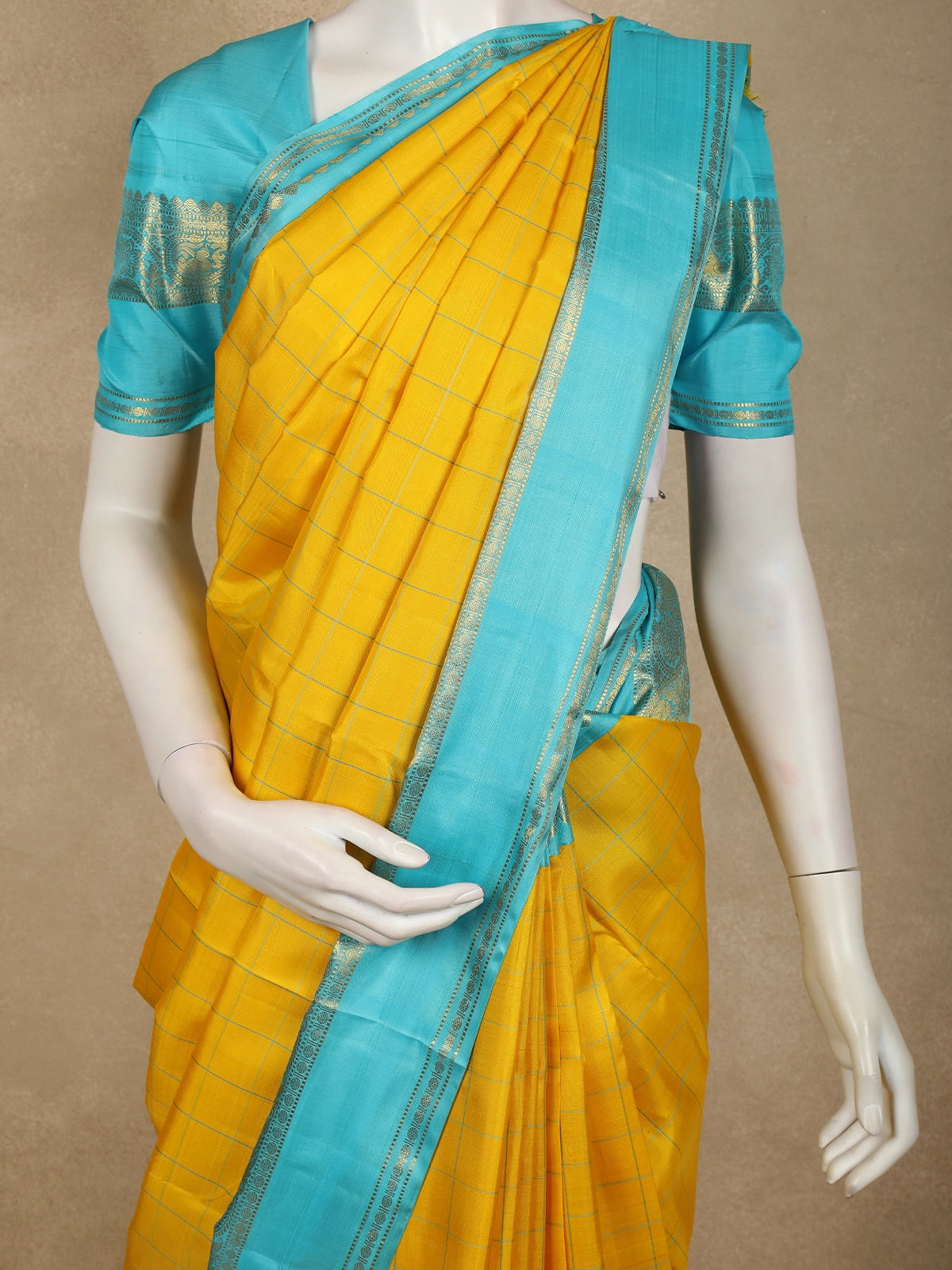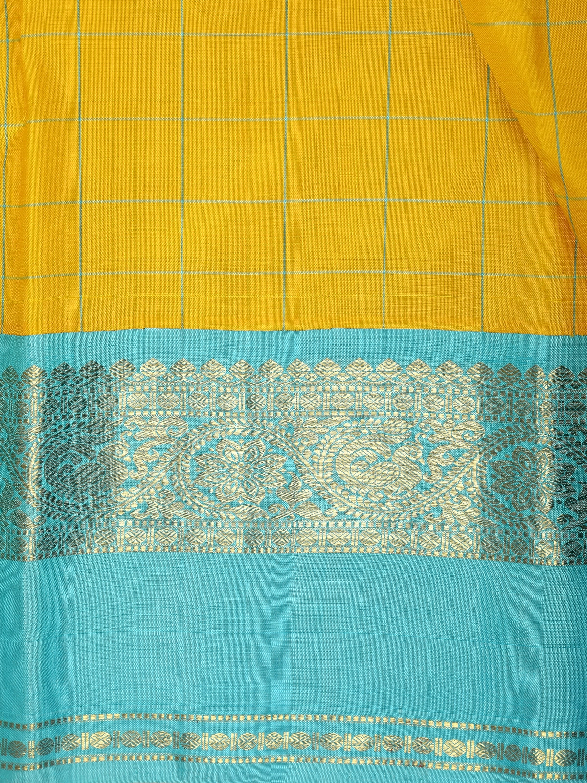 A striking contrast zari border in aqua blue, enriched with delicate gold weaving, frames the saree beautifully and adds a refreshing pop of colour. The harmonious blend of yellow and aqua blue creates a balanced, eye-catching palette, while the zari detailing elevates the saree’s festive appeal. The coordinated pallu and matching blouse with zari accents complete the ensemble.