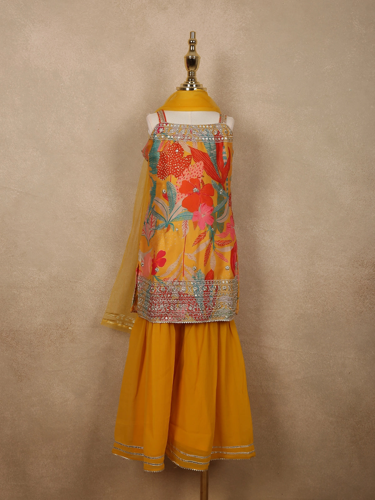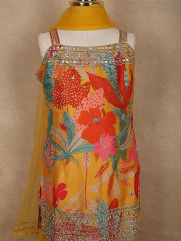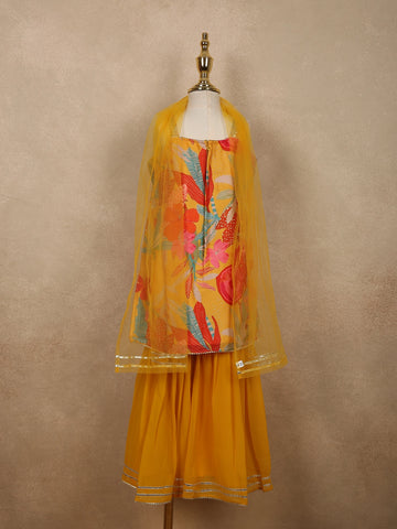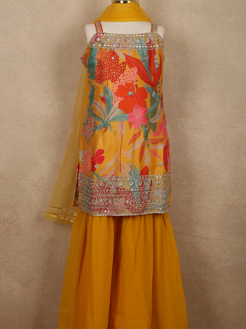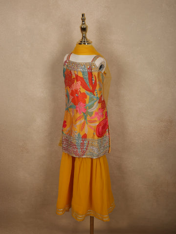 Mustard Yellow Flora Printed Design Georgette Kids Sharara Suit with Dupatta